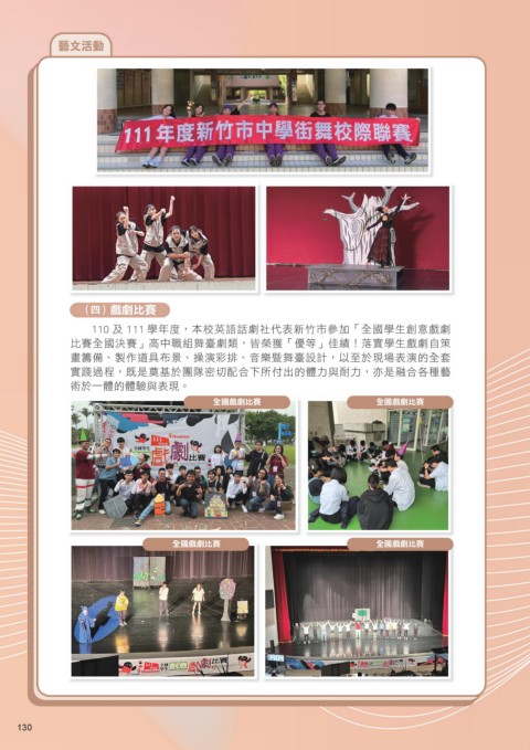 藝文活動 (四)戲劇比賽 110 及 111 學年度,本校英語話劇社代表新竹市參加「全國學生創意戲劇 比賽全國決賽」高中職組舞臺劇類,皆榮獲「優等」佳績!落實學生戲劇自策 畫籌備、製作道具布景、操演彩排、音樂暨舞臺設計,以至於現場表演的全套 實踐過程,既是奠基於團隊密切配合下所付出的體力與耐力,亦是融合各種藝 術於一體的體驗與表現。 全國戲劇比賽 全國戲劇比賽 全國戲劇比賽 全國戲劇比賽 130