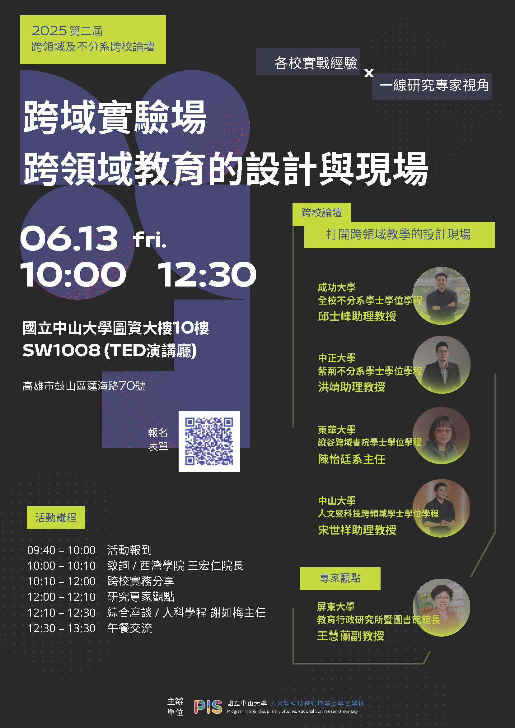 | 主旨: | 敬邀參加「2025第二屆跨領域及不分系跨校論壇」,敬請惠予協助宣傳,並轉知跨領域相關學院、系所之教職員生報名參與,請查照。 |