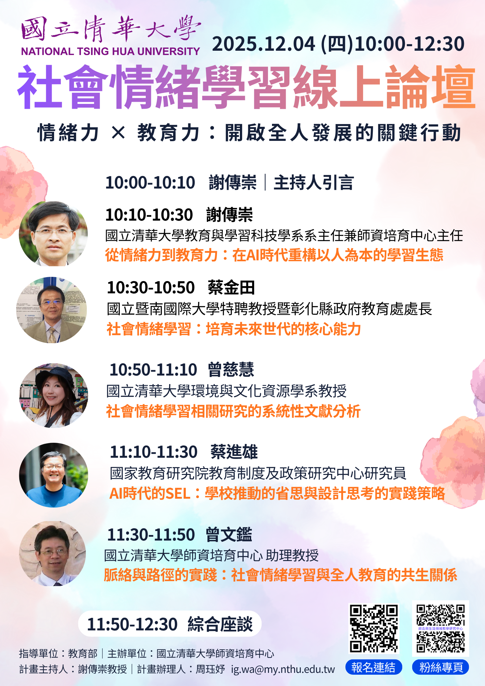 二、 本次論壇以「社會情緒學習線上論壇-情緒力 × 教育力:開啟全人發展的關鍵行動」為主題,本論壇聚焦於社會情緒學習在教育領域的應用與發展,探討如何透過提升情緒能力,促進學習者在AI時代的全人發展,並分享相關研究成果與實踐策略,為教育工作者提供具體的行動方案與啟發。