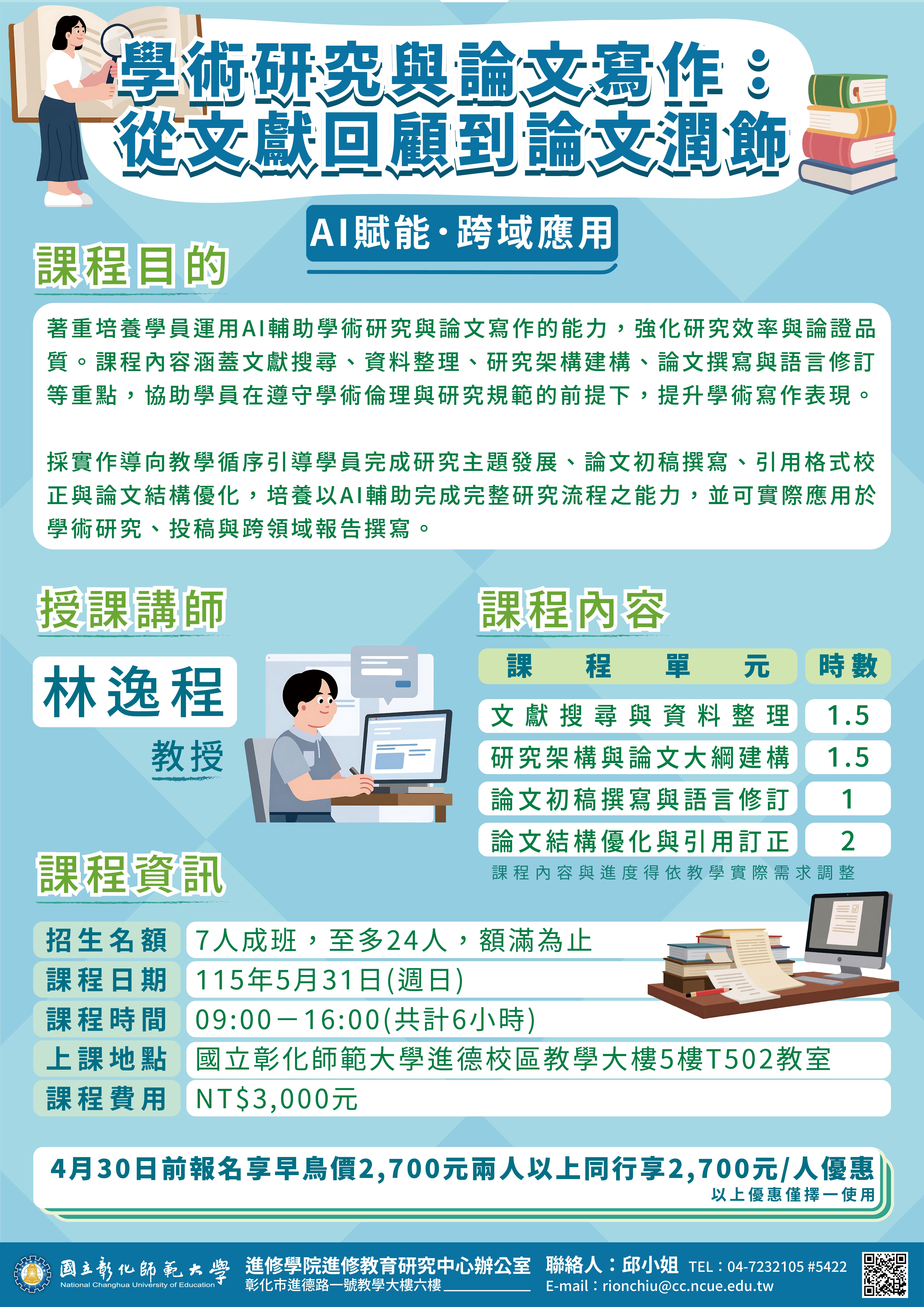 | (三) | 課程費用:3,000元,開課前1個月報名享早鳥價2,700元;兩人以上同行每人享2,700元優惠。以上優惠擇一使用,不可併用。【AI賦能.跨域應用】學術研究與論文寫作舊生另享優惠2,500元。 |