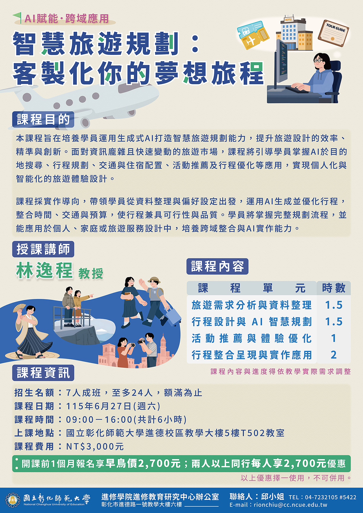 | (一) | 課程特色:課程採實作導向,運用AI生成並優化個人化旅遊行程,整合時間、交通、預算,培養完整規劃能力,並應用於個人或企業專案。 |