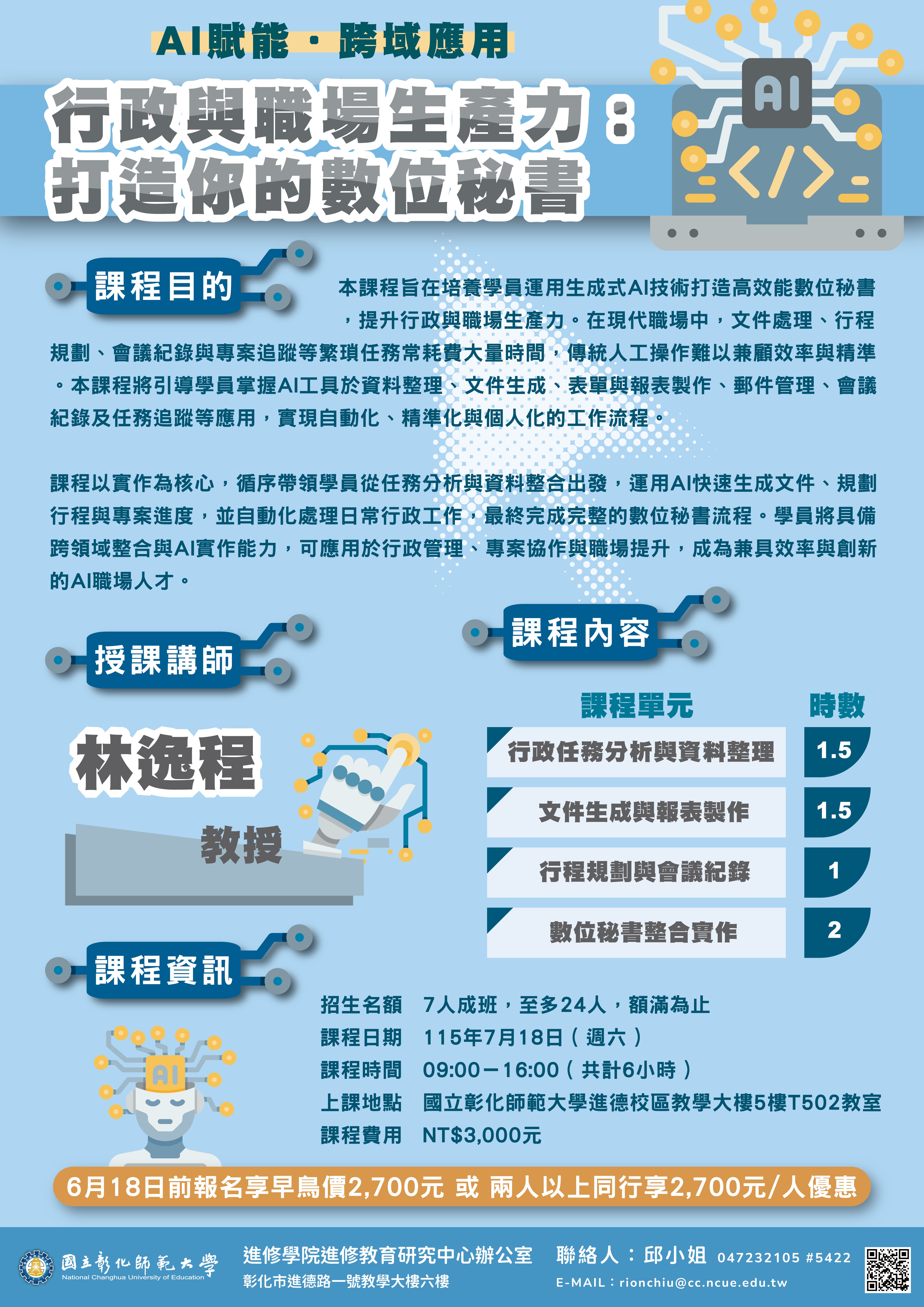 | 三、 | 「【AI賦能.跨域應用】 行政與職場生產力:打造你的數位秘書」 |