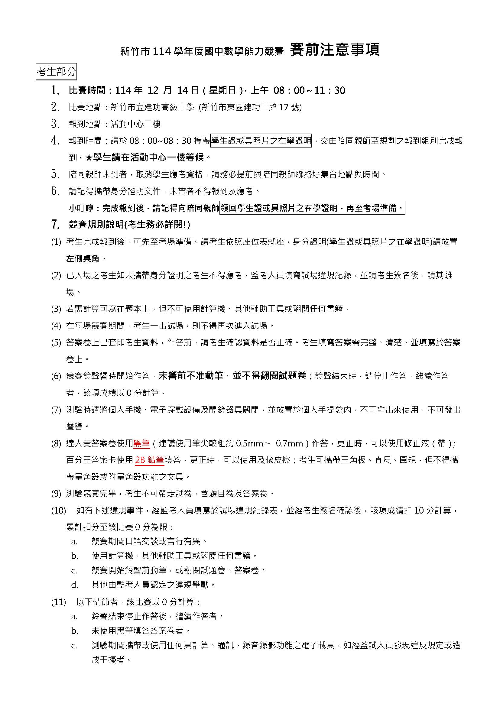 【公告】新竹市114學年度國中數學能力競賽 賽前注意事項