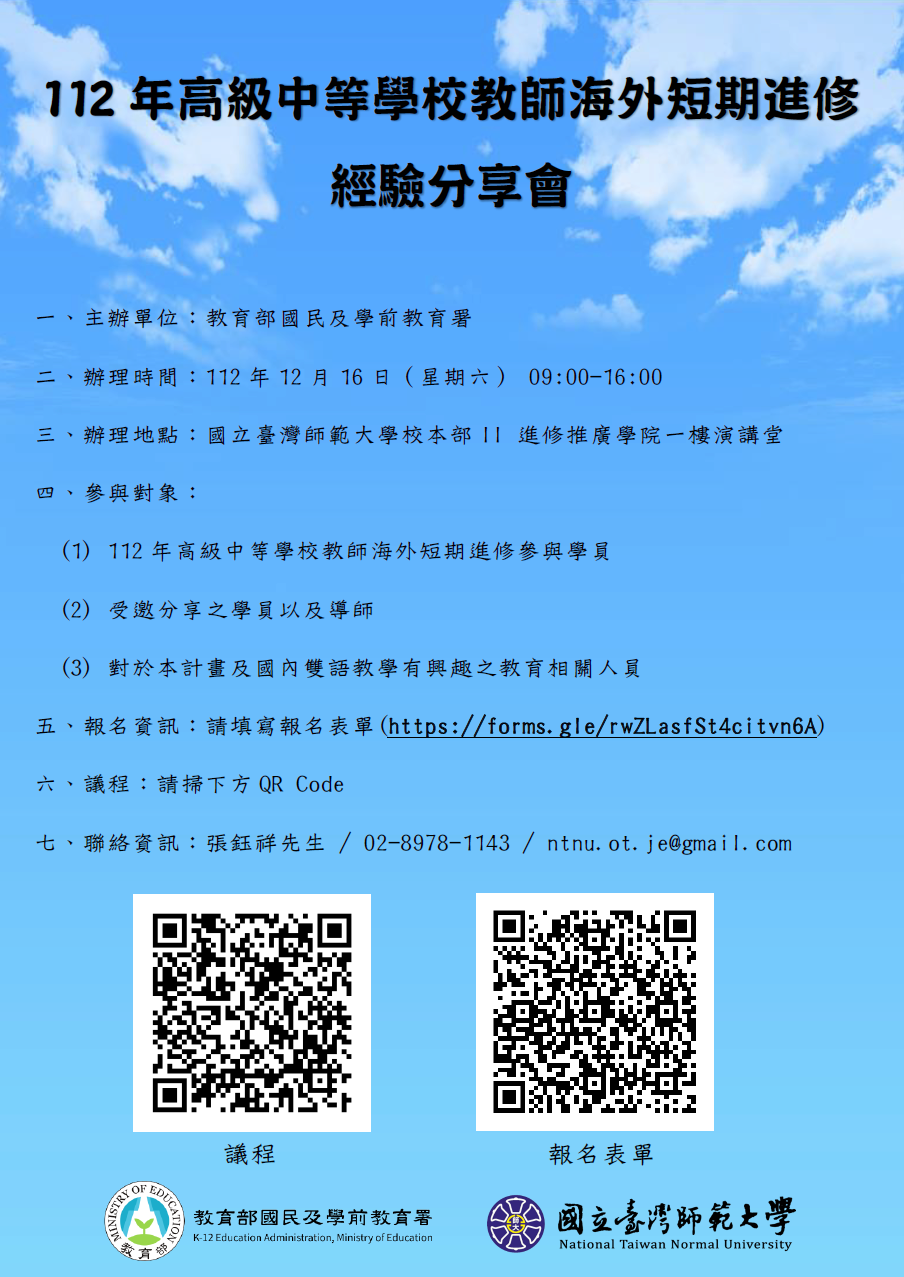 | 二、 | 旨揭分享會訂於112年12月16日(星期六)於國立臺灣師範大學圖書館校區進修推廣學院一樓演講堂辦理,報名網址:https://forms.gle/rwZLasfSt4citvn6A(聯絡資訊:張鈺祥先生/02-8978-1143)。 |