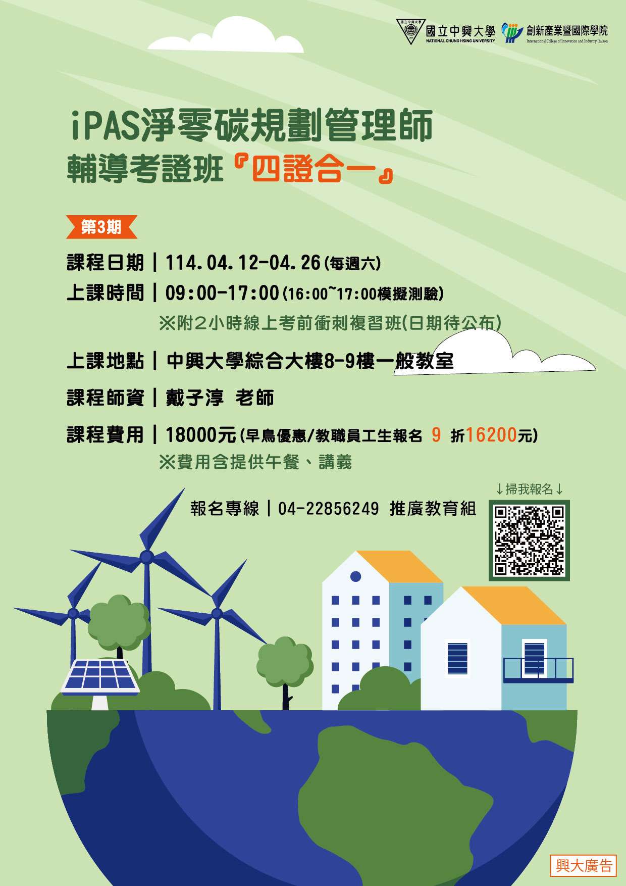 | 主旨: | 本校推廣教育辦理「永續發展碳管理證照培訓班」、「四證合一 iPAS 淨零碳規劃管理師(初級)輔導考證班」招生訊息,即日起開放報名,請惠予公告周知,並轉知貴單位同仁及師生踴躍報名參加,請查照。 |