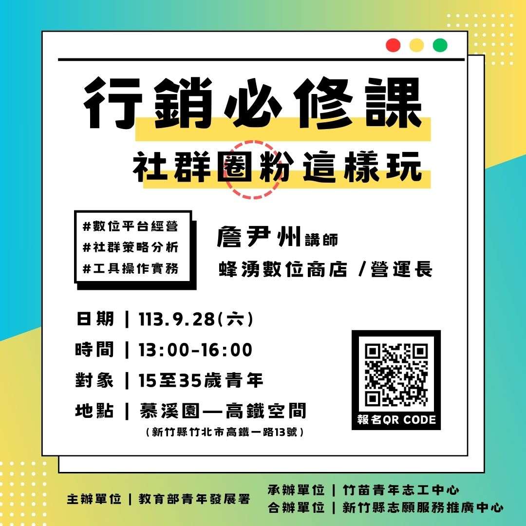 轉知教育部青年發展署竹苗青年志工中心辦理「行銷必修課:社群圈粉這樣玩」培力課程,鼓勵參加。