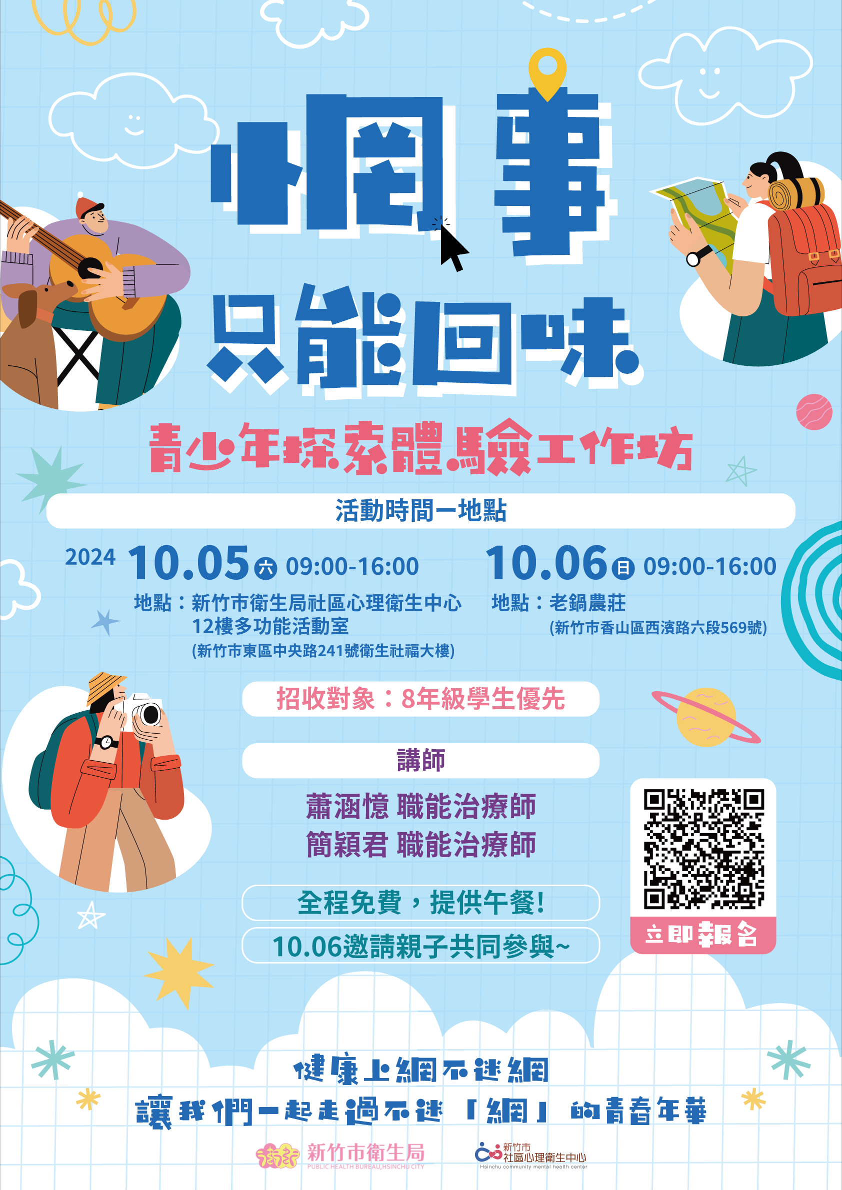 | 新竹市社區心理衛生中心辦理「惘事只能回味」-青少年探索體驗工作坊,請學校鼓勵學生報名參加,詳如說明,請查照。 |