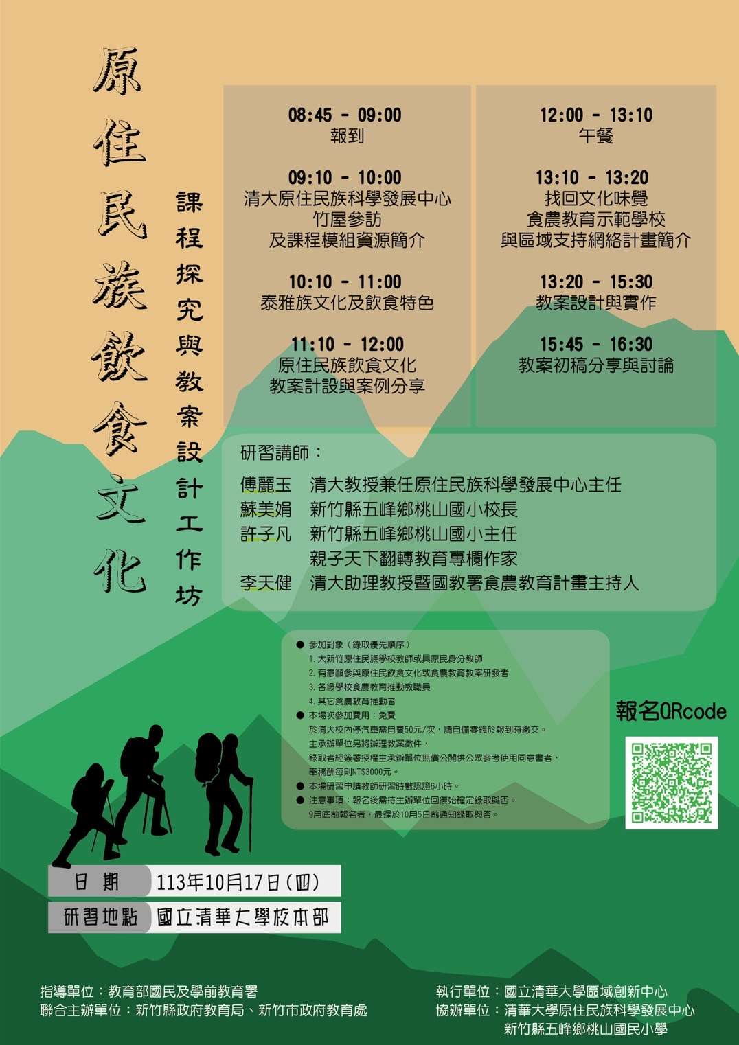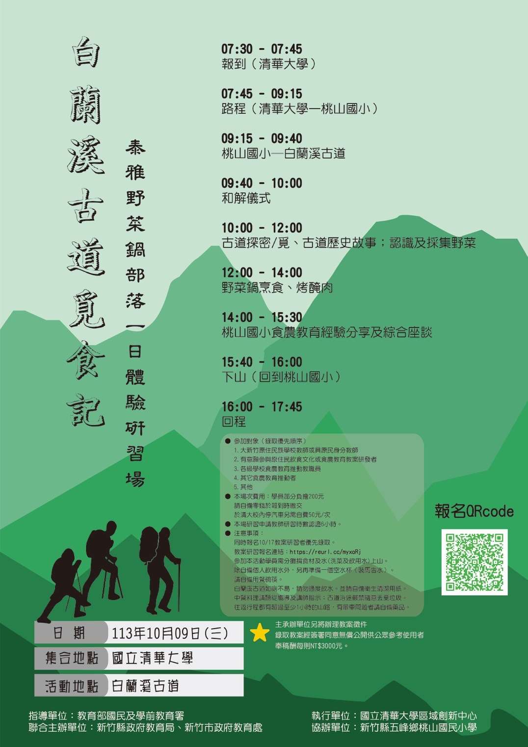 | 主旨: | 檢送國立清華大學辦理「113年白蘭溪古道覓食記暨原住民族飲食文化教案設計複合式增能研習工作坊」,詳如說明,請查照。 |