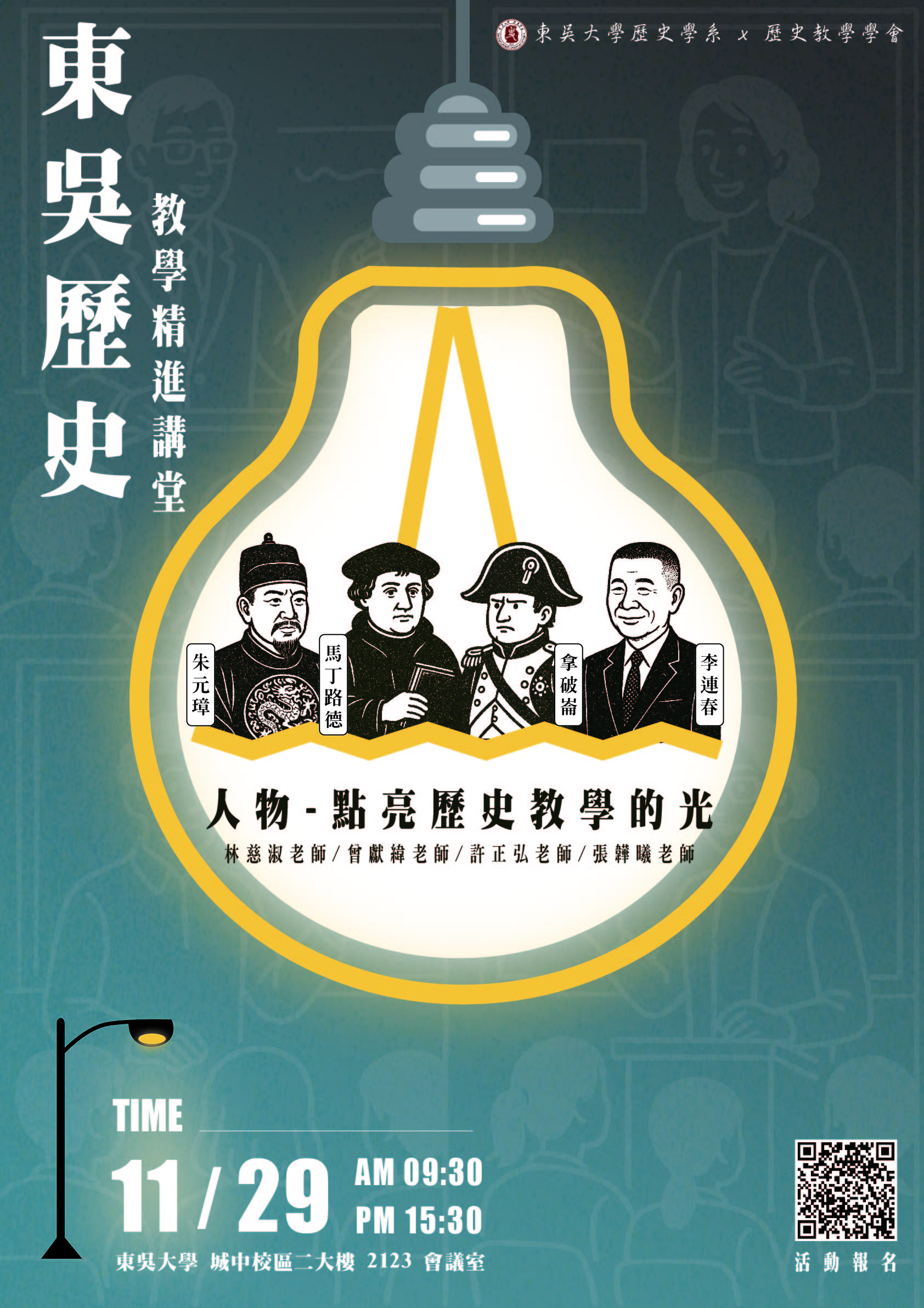| 一、 | 為因應歷史教學的新趨勢與新挑戰,本校歷史學系規劃辦理「東吳歷史教學精進講堂」活動,由本系專任教師以歷史人物為主題,分享研究成果、教學策略及反思,並透過彼此的交流與討論,激盪出歷史教學與研究的新思維與新方法。 |