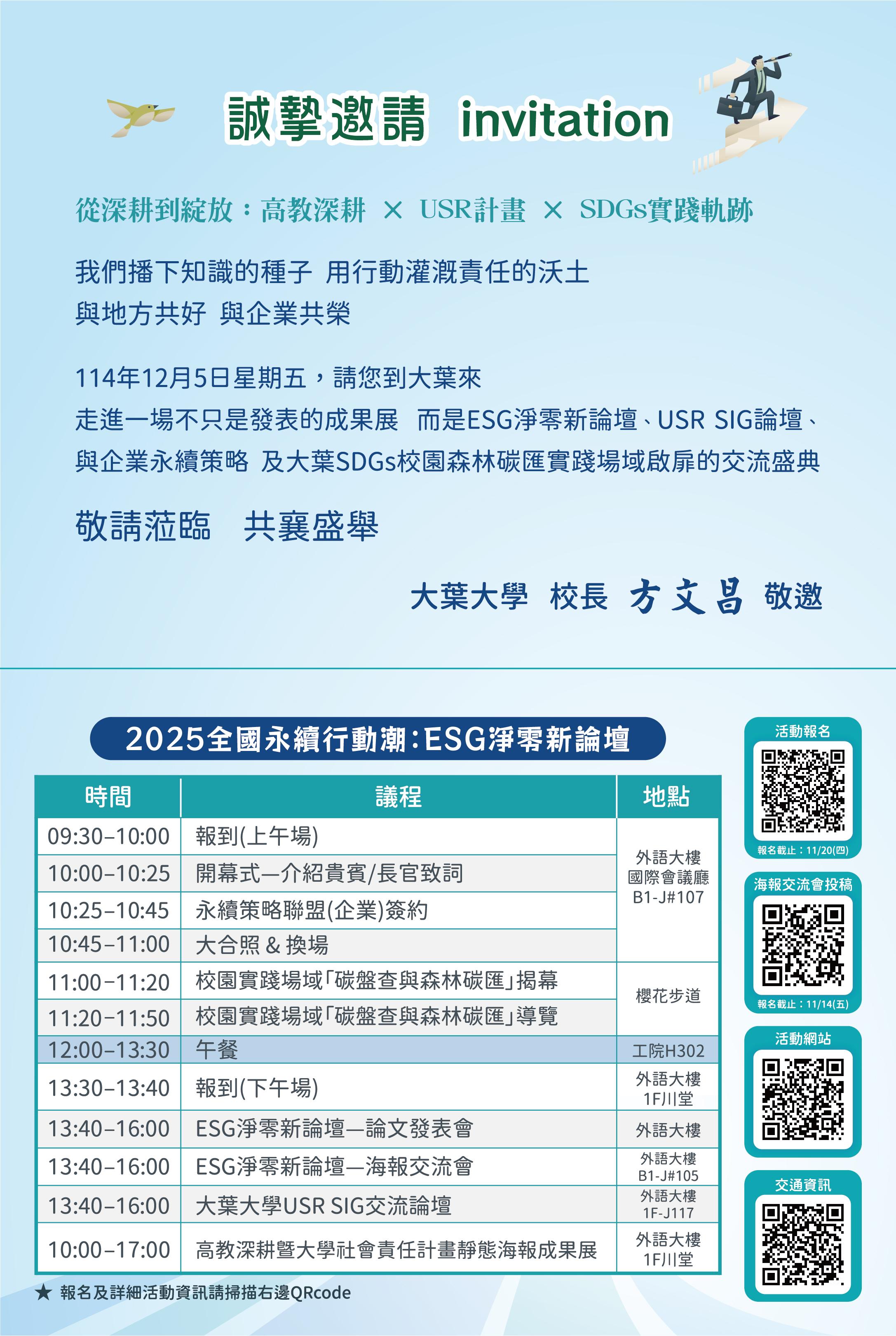 | 主旨: | 本校謹訂於114年12月5日(星期五)辦理「114年度高教深耕/USR計畫成果發表會」,並將針對「2025全國永續行動潮:ESG淨零新論壇」議題進行徵稿,敬請惠予公告相關訊息,並鼓勵師生踴躍投稿,請查照。 |