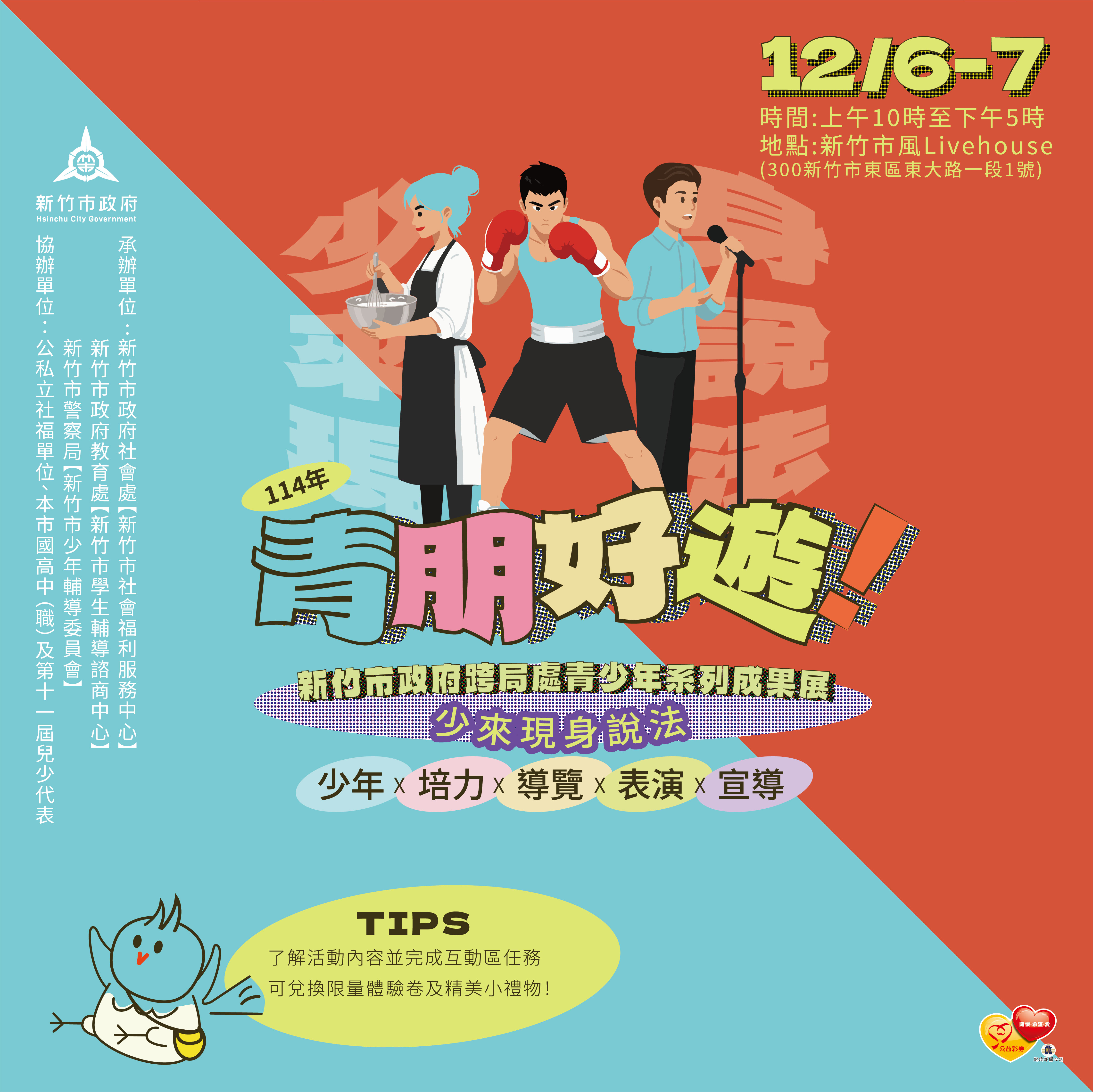 | 新竹市社會福利服務中心辦理「青朋好遊」-114年新竹市政府跨局處青少年系列成果展活動資料一份,敬邀貴局處、所屬相關單位、貴校及兒少共同參與,並協助廣為宣傳周知,請查照。 |