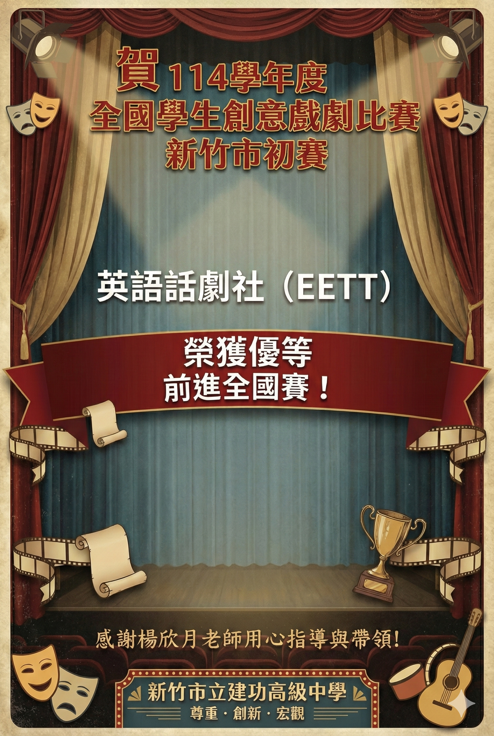 恭喜本校高中部英語話劇社(EETT)參加「114學年度全國學生創意戲劇比賽‧新竹市初賽」高中職組舞臺劇類,榮獲「優等」!