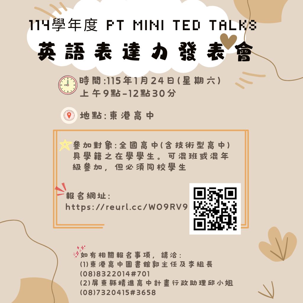 | 主旨: | 檢送屏東縣政府辦理「114學年度 PT Mini TED Talks 英語表達力發表會」實施計畫及海報各1份,請貴校踴躍報名參加,詳如說明,請查照。 |