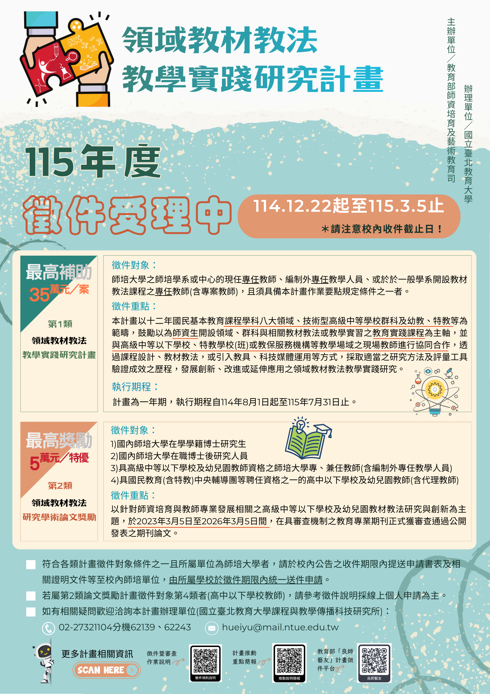 2、 上述資料均須於徵件截止日(115年3月5日)前完成系統填報與相關檔案上傳提交,並將申請名冊併附函文送達本計畫委辦單位(國立臺北教育大學),以郵戳為憑,凡逾期送件、資料不全、申請程序不符規定或逾期未依通知補件者,均不予受理。