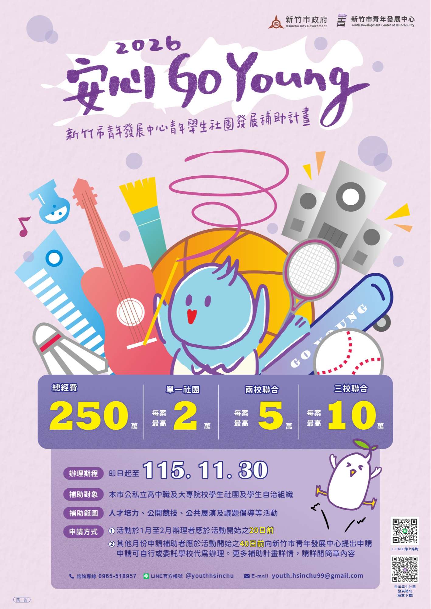 四、 為辦理計畫需要,請貴校於115年1月30日前協助彙整立案社團及學生自治組織名冊,俾利後續計畫核辦(免備文,E-mail:youth.hsinchu99@gmail.com)。