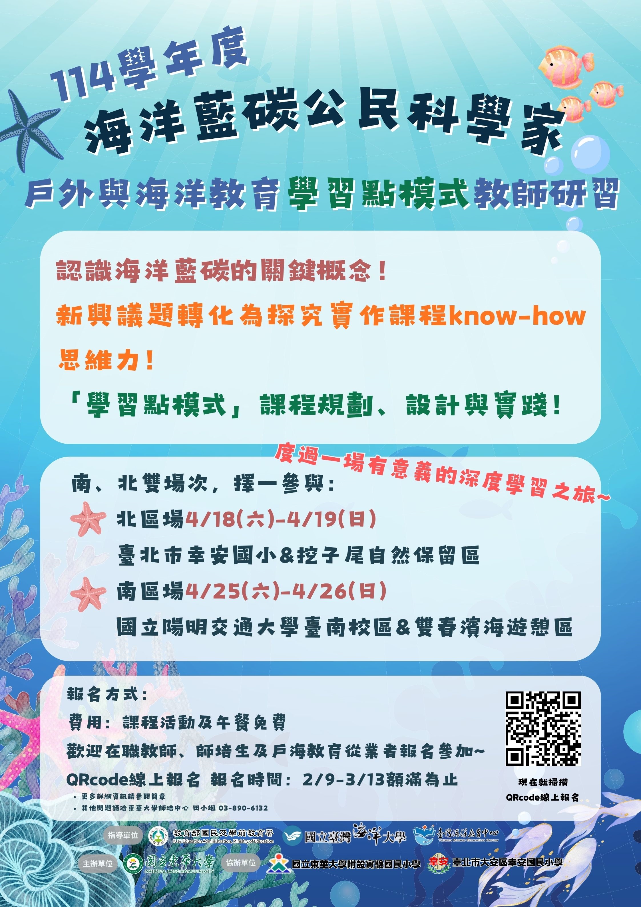 二、 旨案研習以「淨零碳排」為主軸,聚焦海洋藍碳與戶外、海洋教育課程設計,透過專業講授與實地探究活動,提升學習點模式課程規劃與教學實踐專業知能,研習資訊如下: