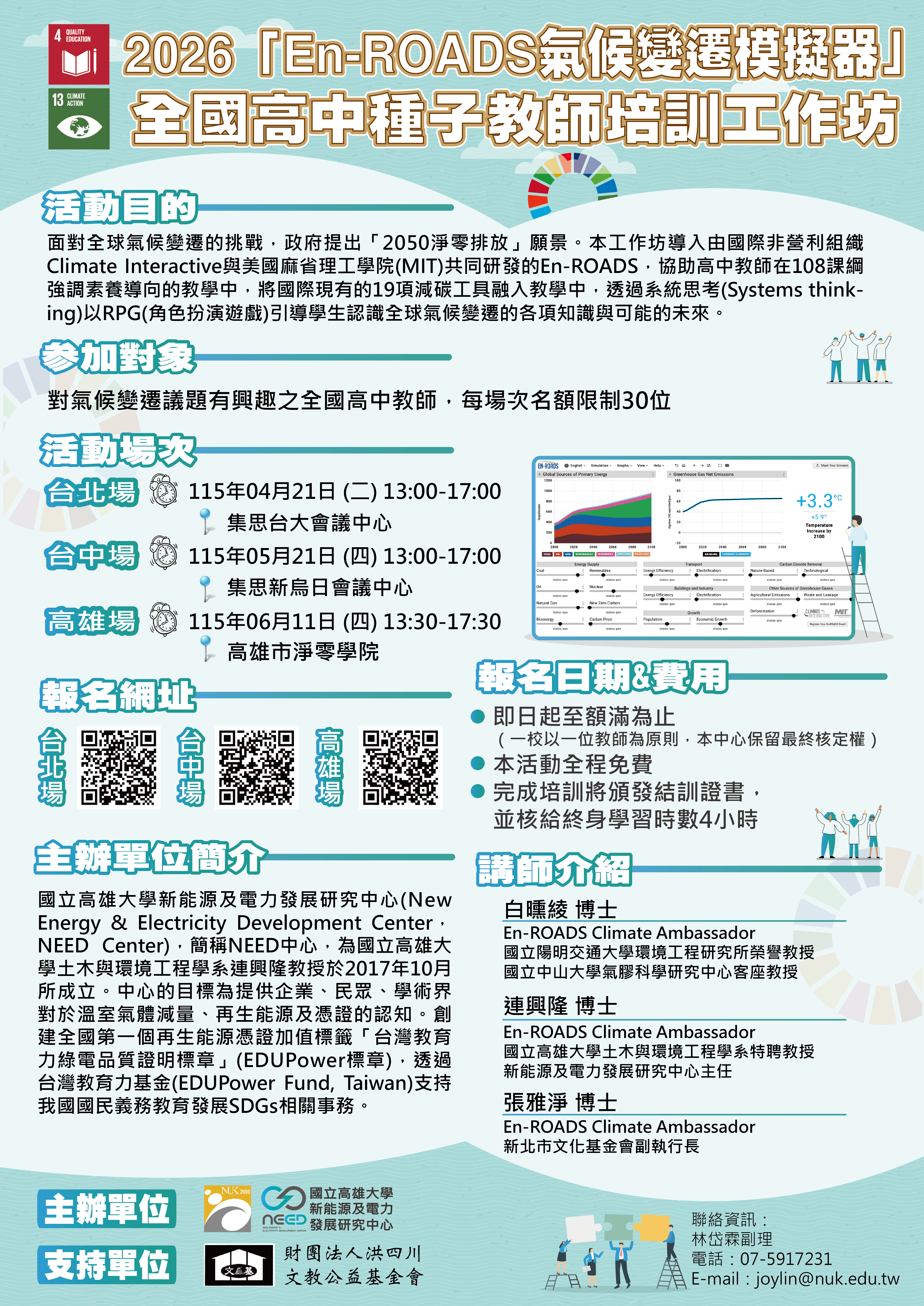 | 主旨: | 國立高雄大學新能源及電力發展研究中心將辦理2026「En-ROADS氣候變遷模擬器」全國高中種子教師培訓工作坊,請查照轉知。 |