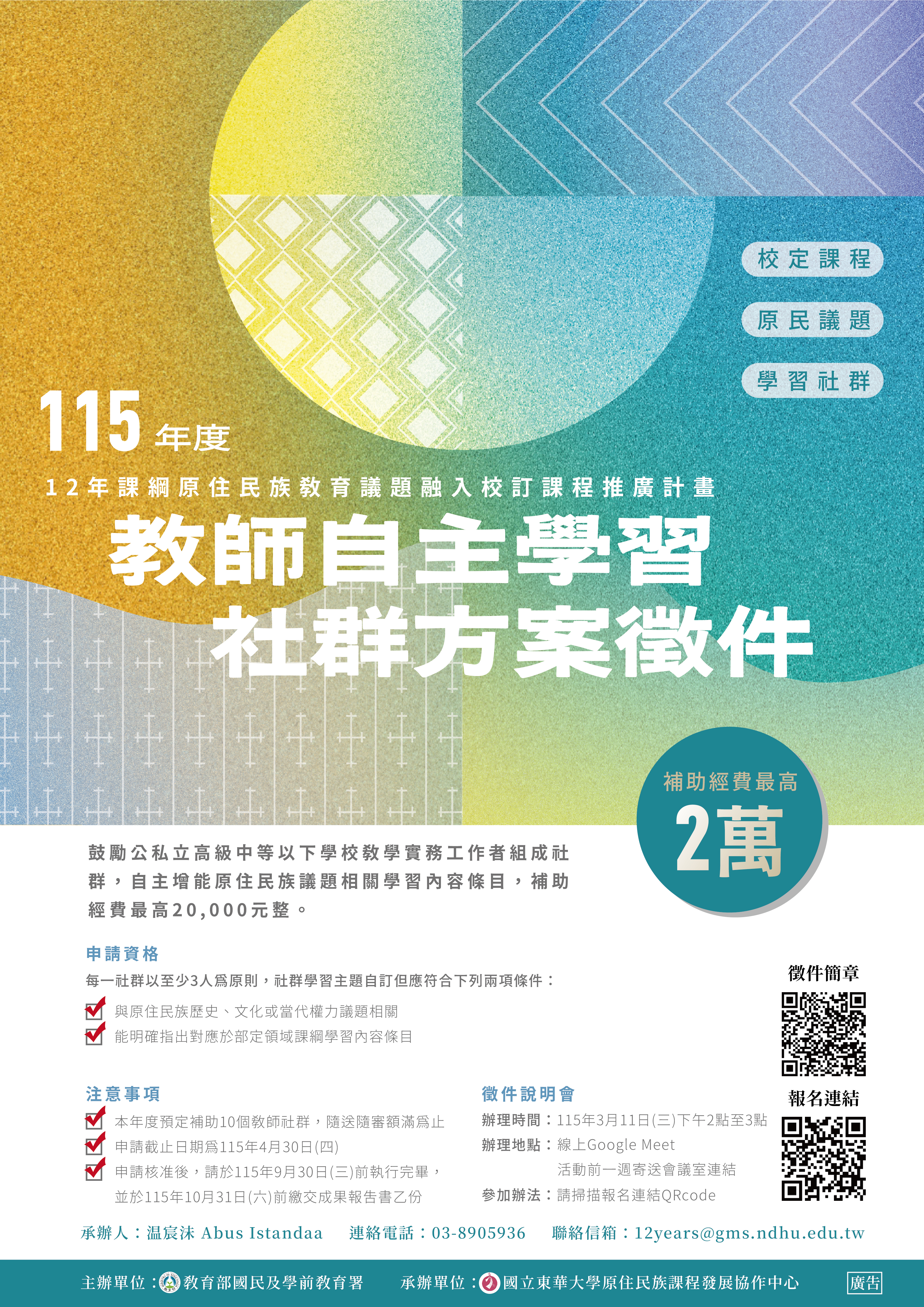 | 主旨: | 檢送教育部國民及學前教育署委請國立東華大學辦理「115年度十二課綱原住民族教育議題融入校訂課程推廣計畫」教師自主學習社群方案徵件簡章及海報各1份,請轉知所屬教師踴躍參與,請查照。 |