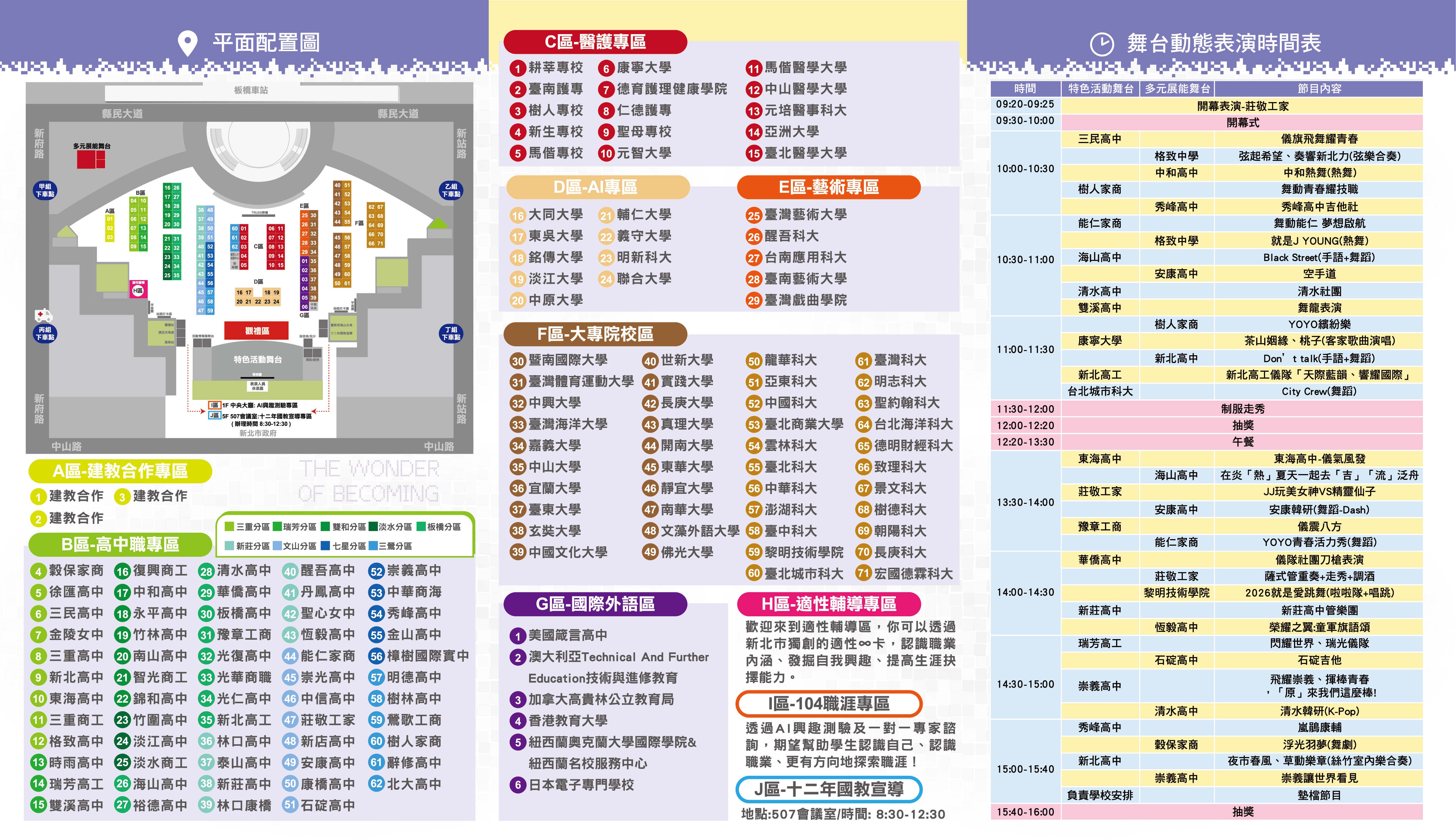 三、 本次博覽會擴大邀請全國71所大專院校及60所新北市優質高中職學校參與,共有超過130所學校特色課程體驗,並設有十大專區體驗,涵蓋建教合作專區、高中職專區、醫護專區、AI專區、藝術專區、大專院校專區、國際外語專區、適性輔導專區、104職涯專區及十二年國教宣導專區等,另安排超過30個精彩的表演節目,歡迎北北基桃國高中學生及家長來現場參加,瞭解新北市優質高中職學校及大專院校特色。