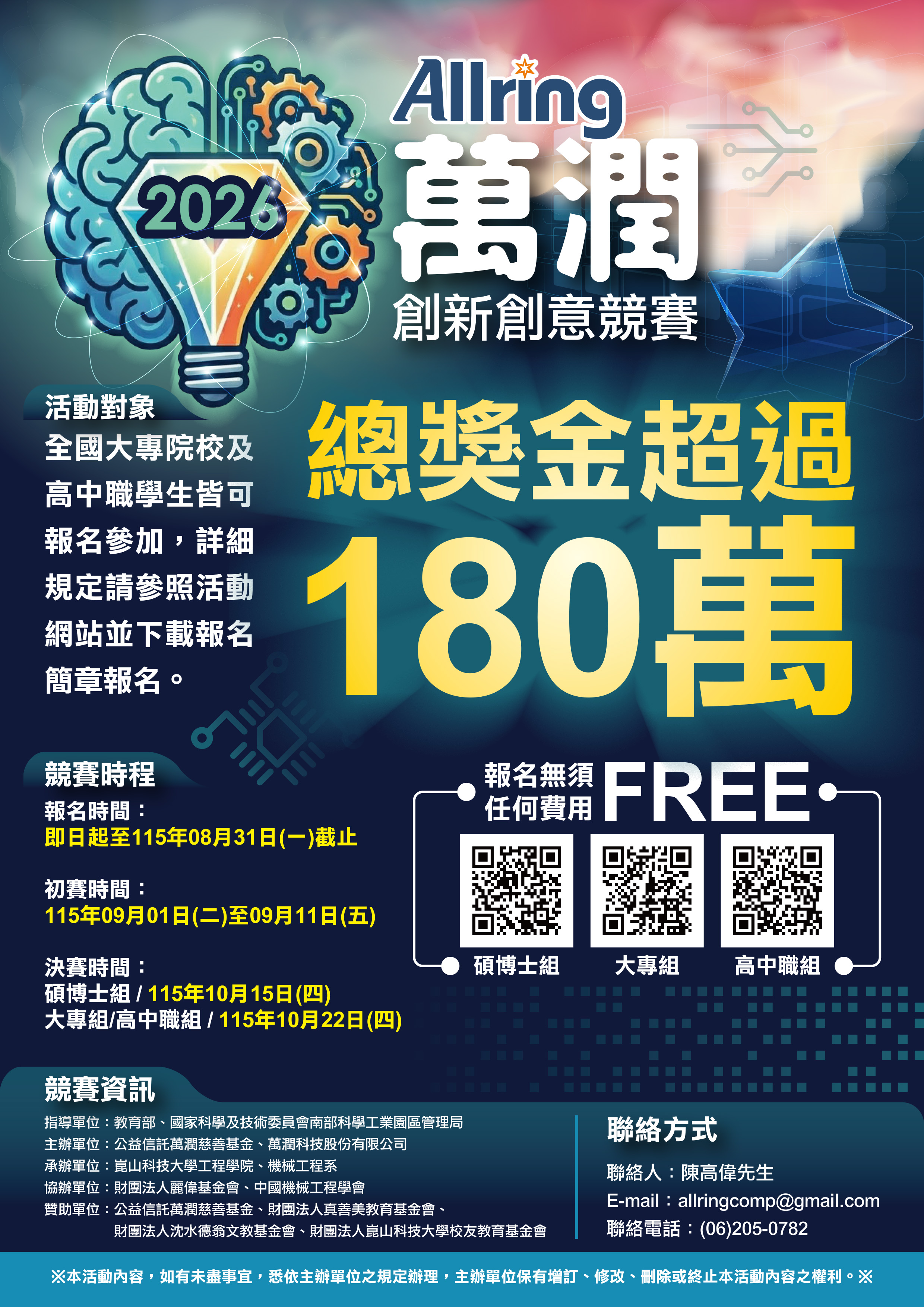 | 六、 | 競賽聯絡人:陳高偉先生,電話:(06)272-7175#540、(06)205-0782,電子信箱:allringcomp@gmail.com |