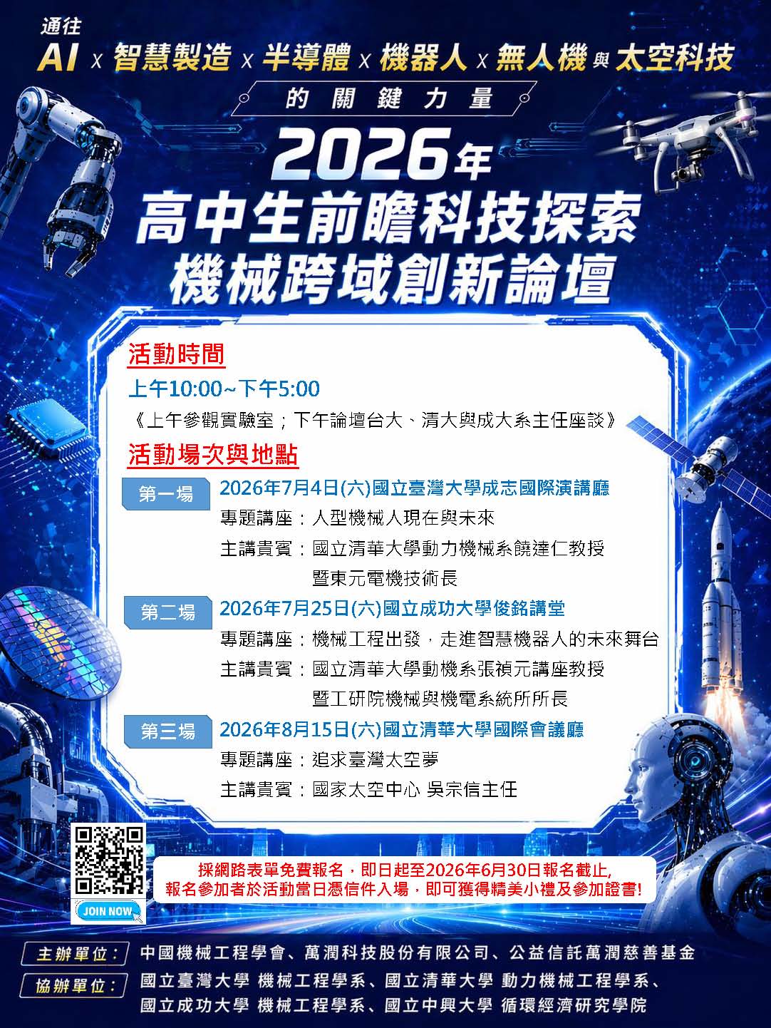 一、 為因應人工智慧(AI)、半導體與智慧製造快速發展趨勢,培育具跨領域整合能力之未來科技人才,中國機械工程學會與萬潤科技股份有限公司共同辦理「2026 高中生前瞻科技探索—機械跨域創新論壇」。