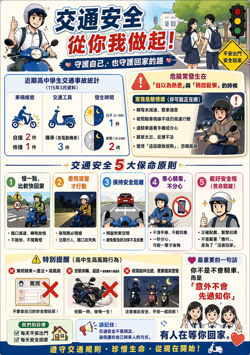 經校園安全暨災害防救通報處理中心統計,115年3月份全國高級中等學校學生交通意外死亡事件計3件,事故樣態如下: