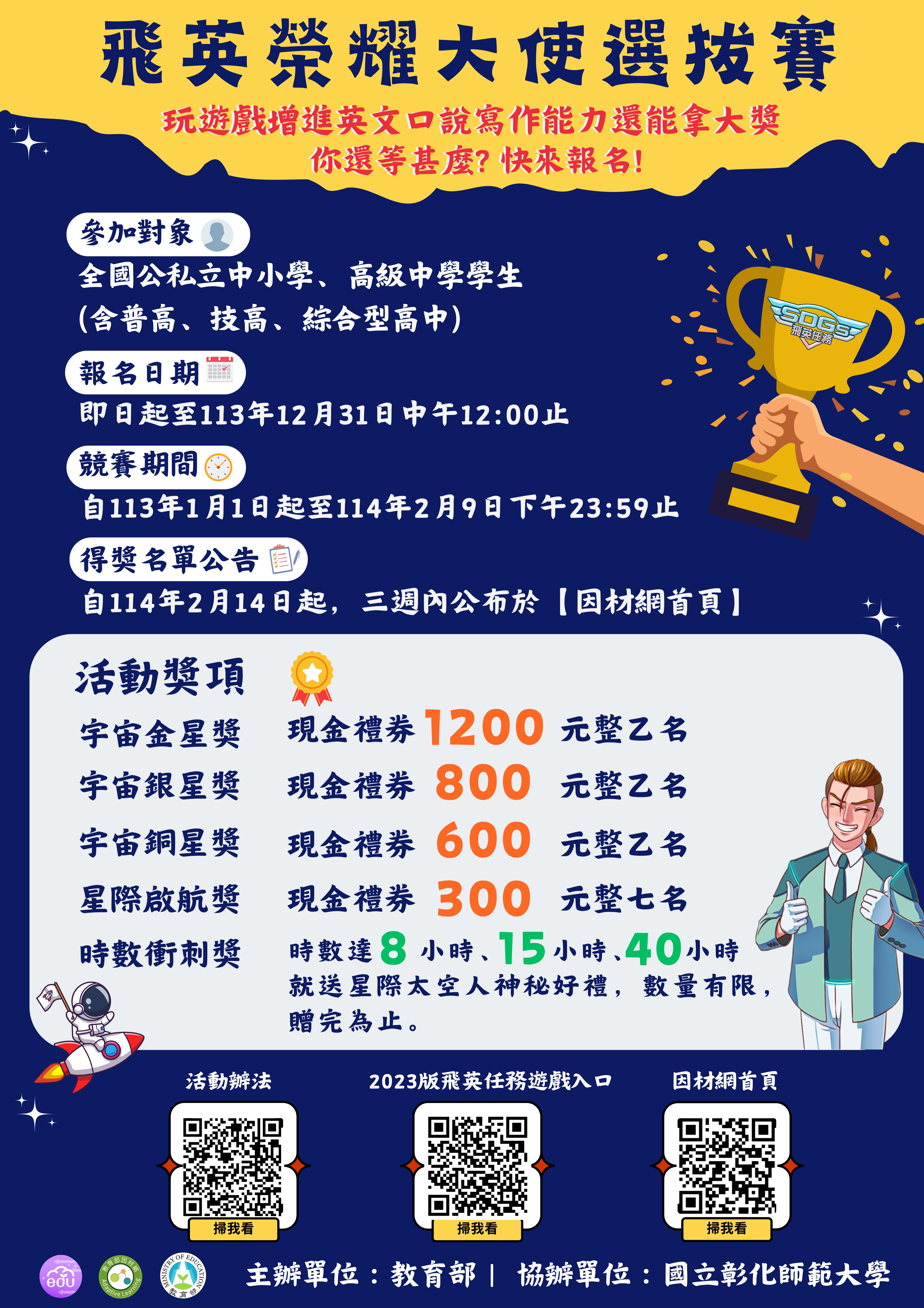 | 二、 | 為提升全國中小學及高級中學學生的英語口說與寫作能力,教育部『高中英語文口說及寫作遊戲開發與推廣計畫』推出「SDGs 飛英大使年度排行榜積分賽」,邀請學生成為「飛英大使」。此遊戲式教材結合SDGs主題影片與互動任務,幫助學生提升聽力、口說及寫作能力,並鼓勵學生持續運用該平台素材強化英語學習動機。 |