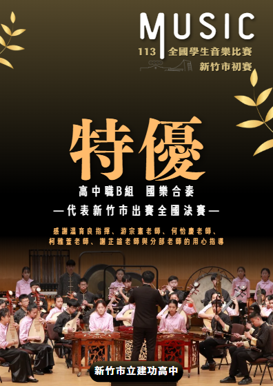 恭喜本校國樂團參加「113學年度全國學生音樂暨鄉土歌謠比賽‧新竹市初賽」國樂合奏高中職團體B組,榮獲特優佳績,並代表新竹市參加全國決賽!