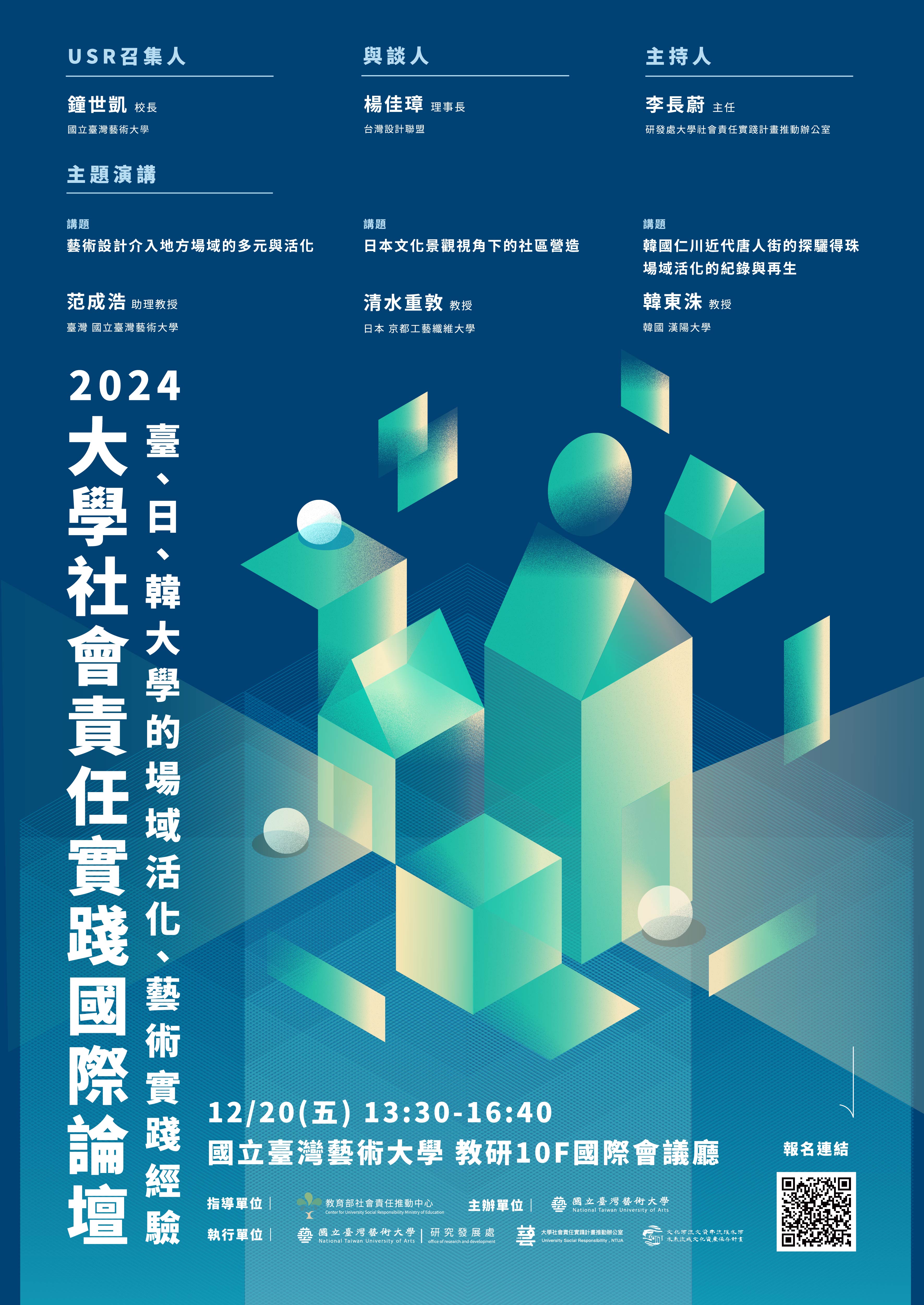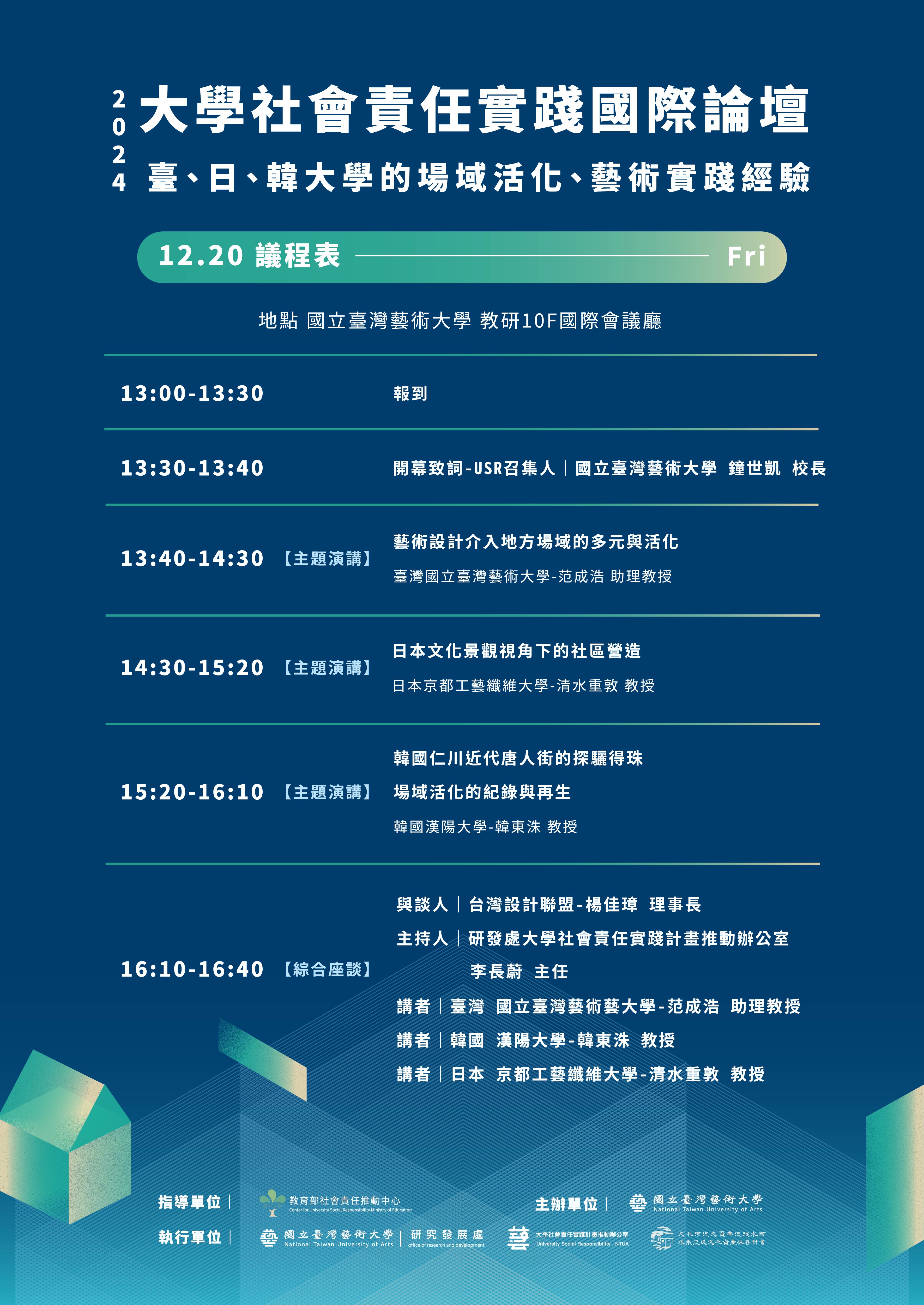 | 主旨: | 本校訂於113年12月20日(星期五)辦理「2024大學社會責任實踐國際論壇:臺、日、韓大學的場域活化、藝術實踐經驗」,敬請惠予公告並鼓勵師生踴躍參加,請查照。 |