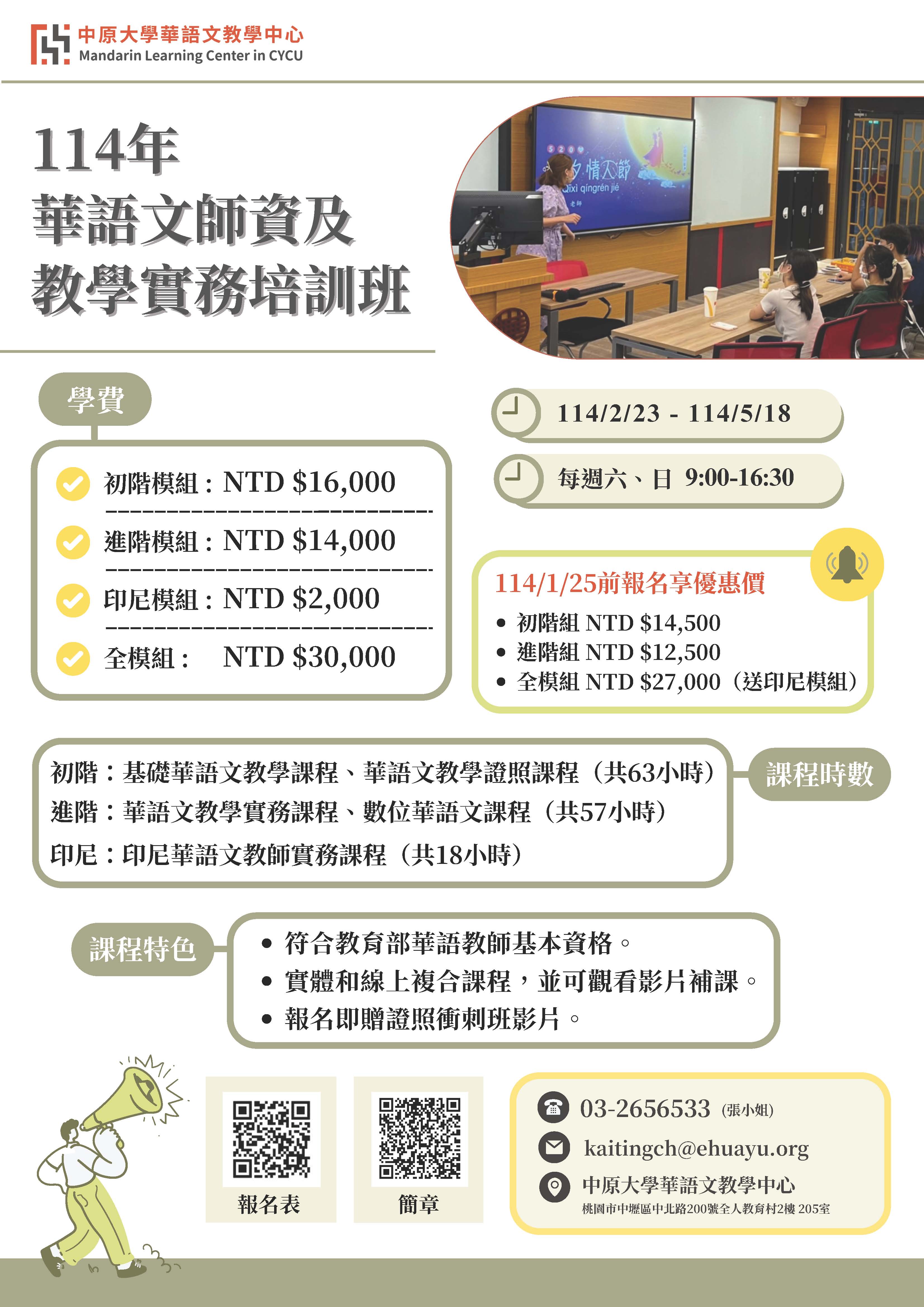 | 主旨: | 檢送本校辦理「114年華語文師資及教學實務培訓班」招生海報1份,請惠予協助公告宣傳,請查照。 |