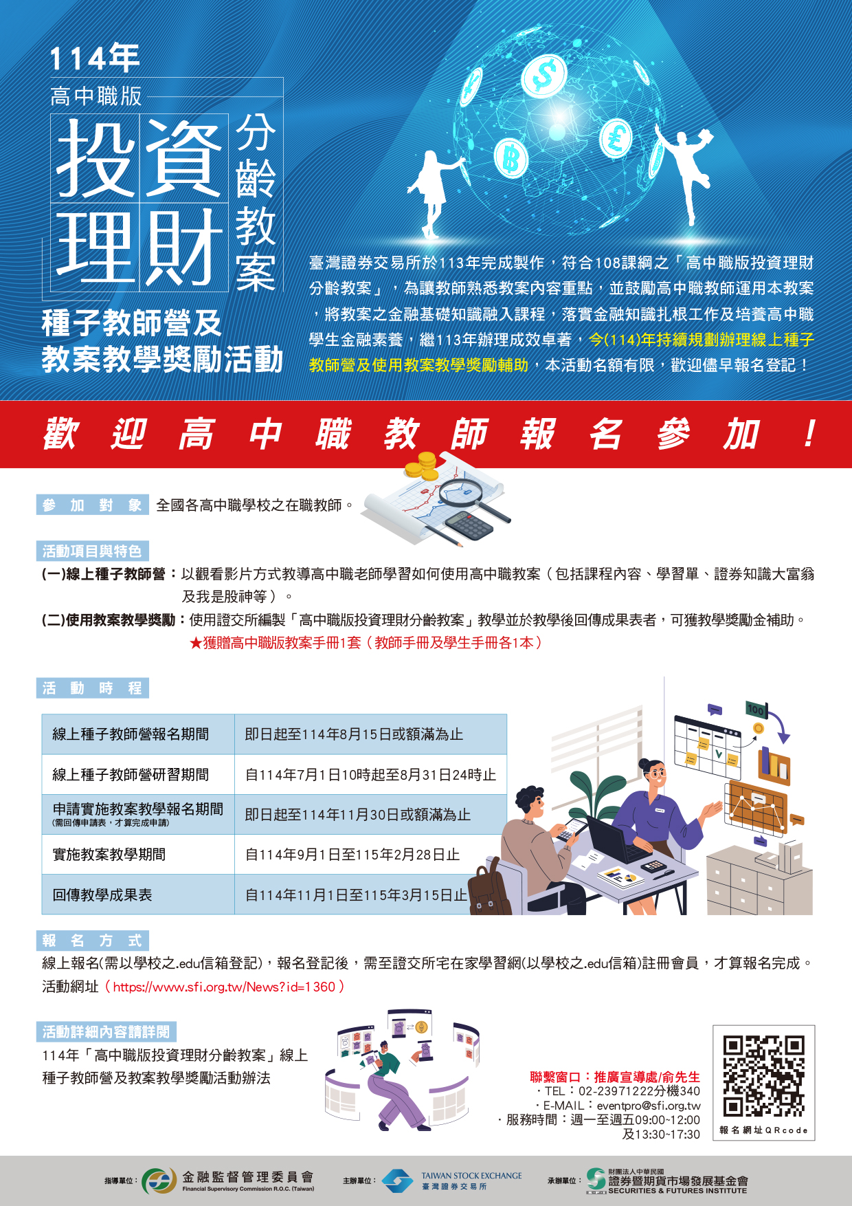 | 主旨: | 檢送114年「高中職版投資理財分齡教案」種子教師營及教案教學獎勵活動辦法與EDM各一份,敬請惠予協助宣傳,並鼓勵教師報名參加。 |
