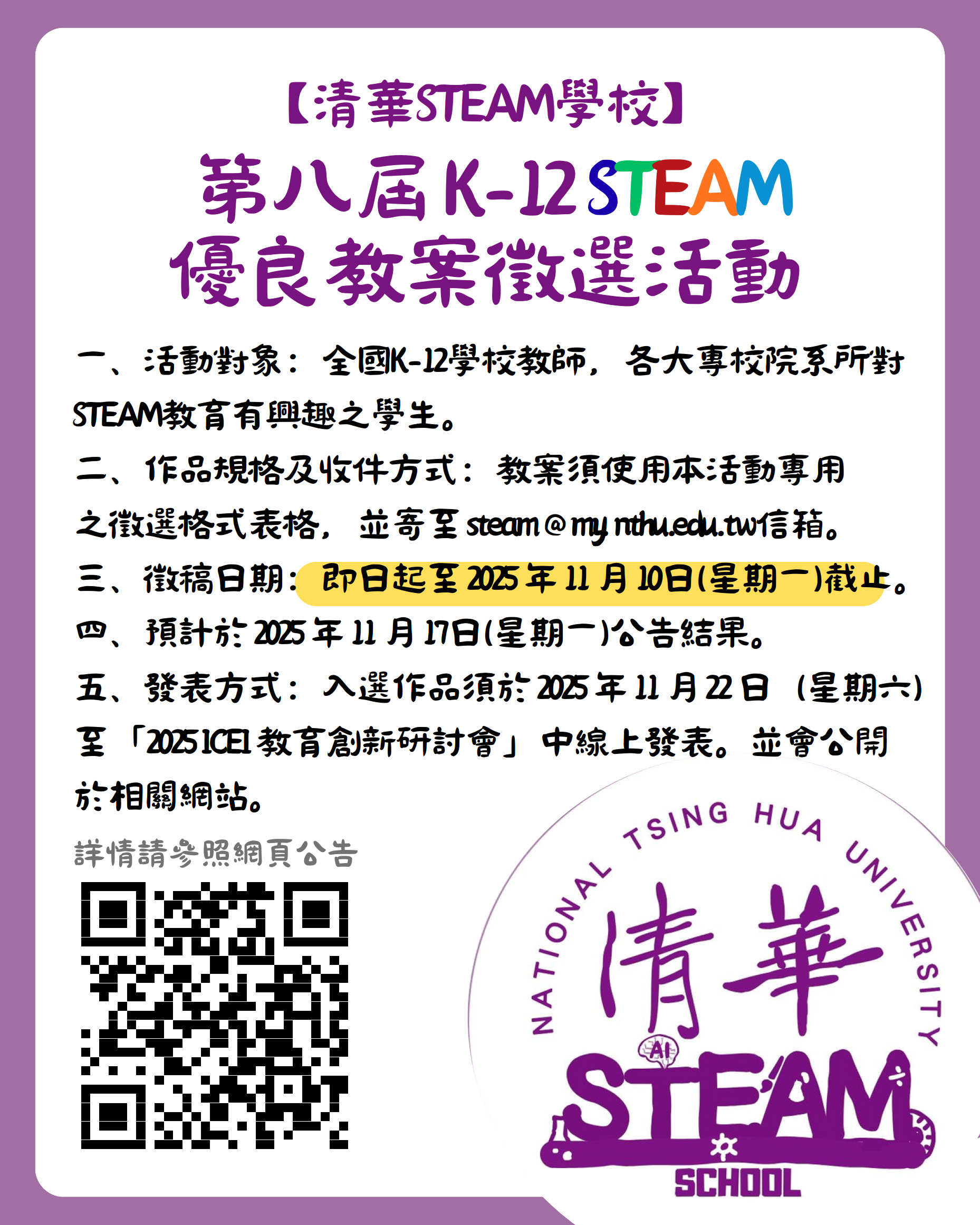 三、 「【清華STEAM學校】K-12 STEAM優良教案徵選」獲選者將於114年11月17日公告名單,須於114年11月22日至2025 ICEI教育創新國際學術研討會線上發表,並將頒予獎狀1紙。