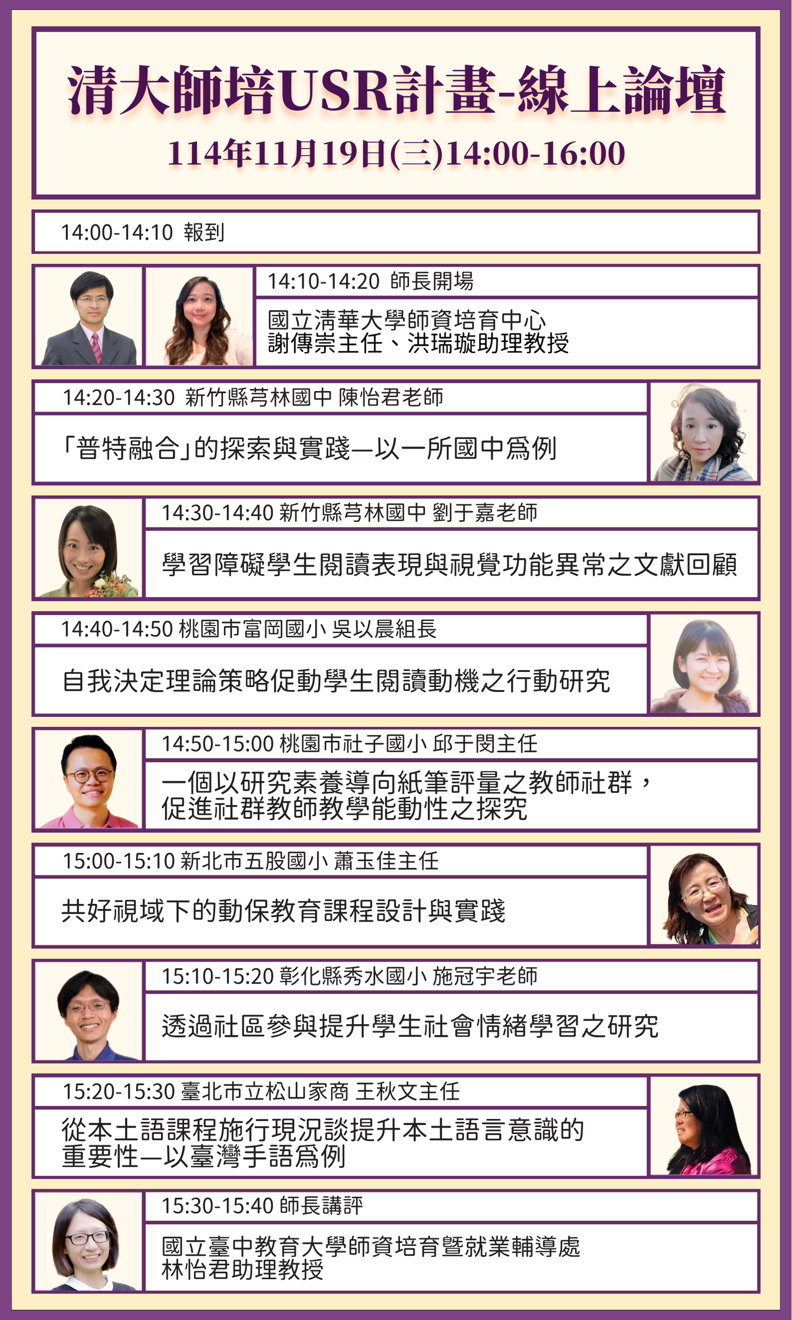二、 為推廣該校USR計畫之研究成果,爰辦理線上論壇,邀請參與計畫教師分享教學實踐與行動研究經驗,以促進跨域交流與專業對話。