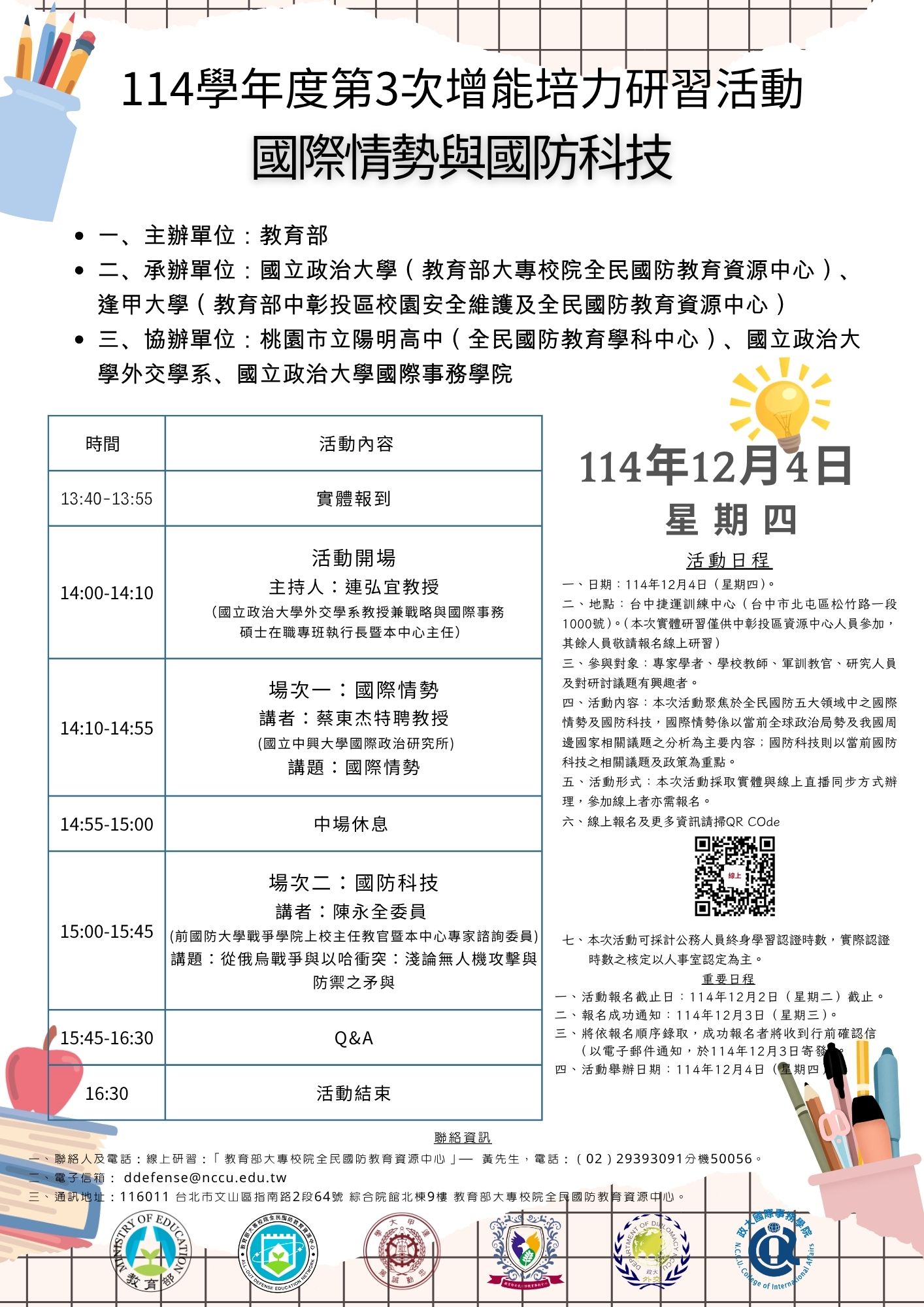 | 主旨: | 檢送「教育部大專校院全民國防教育資源中心114學年度第3次增能培力研習活動」實施計畫及海報各1份,敬請惠予公告並鼓勵貴屬教師、職員、軍訓教官及對議題有興趣者踴躍參與,請查照。 |