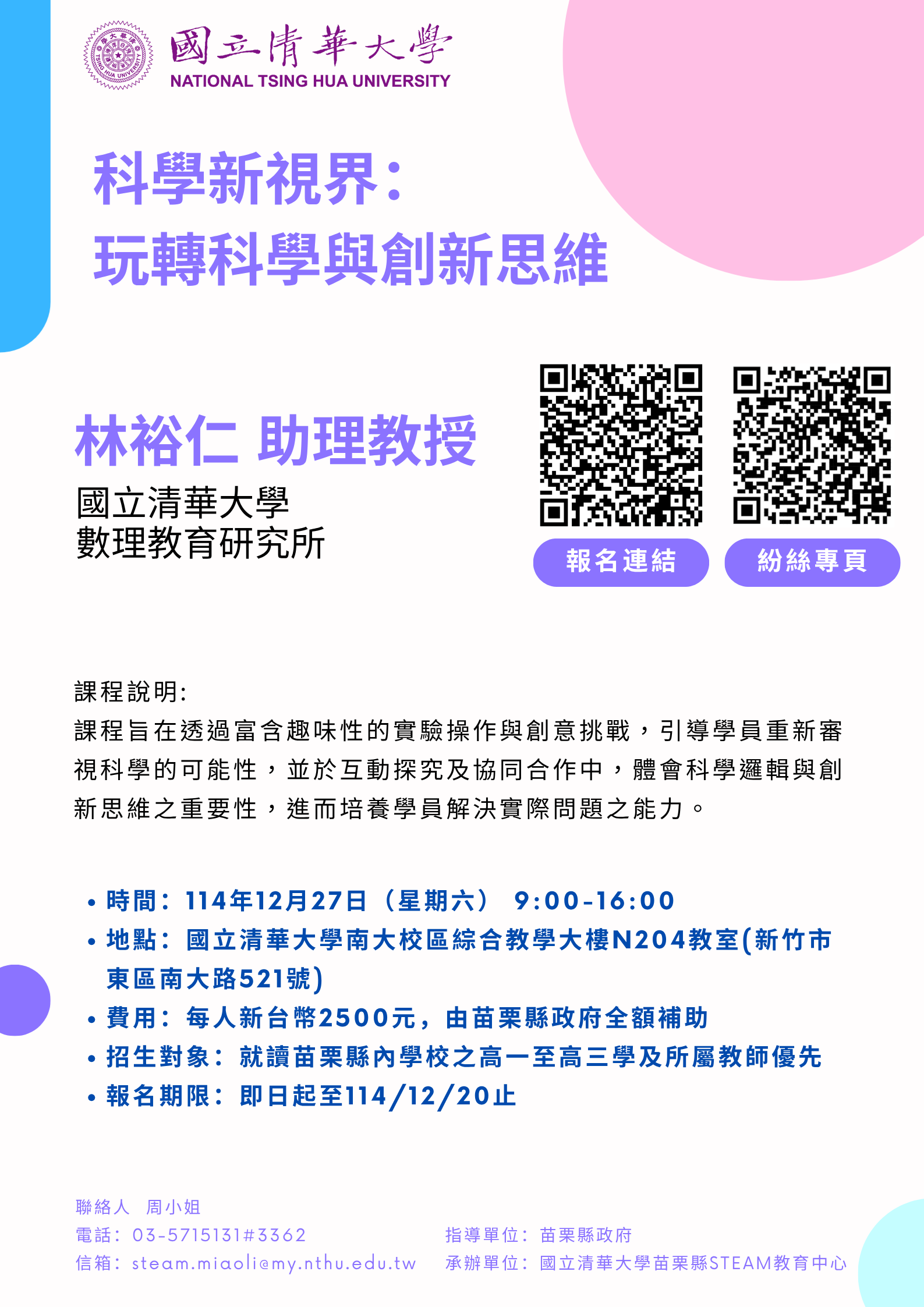 【轉知】清華大學苗栗縣STEAM教育中心「科學新視界:玩轉科學與創新思維」