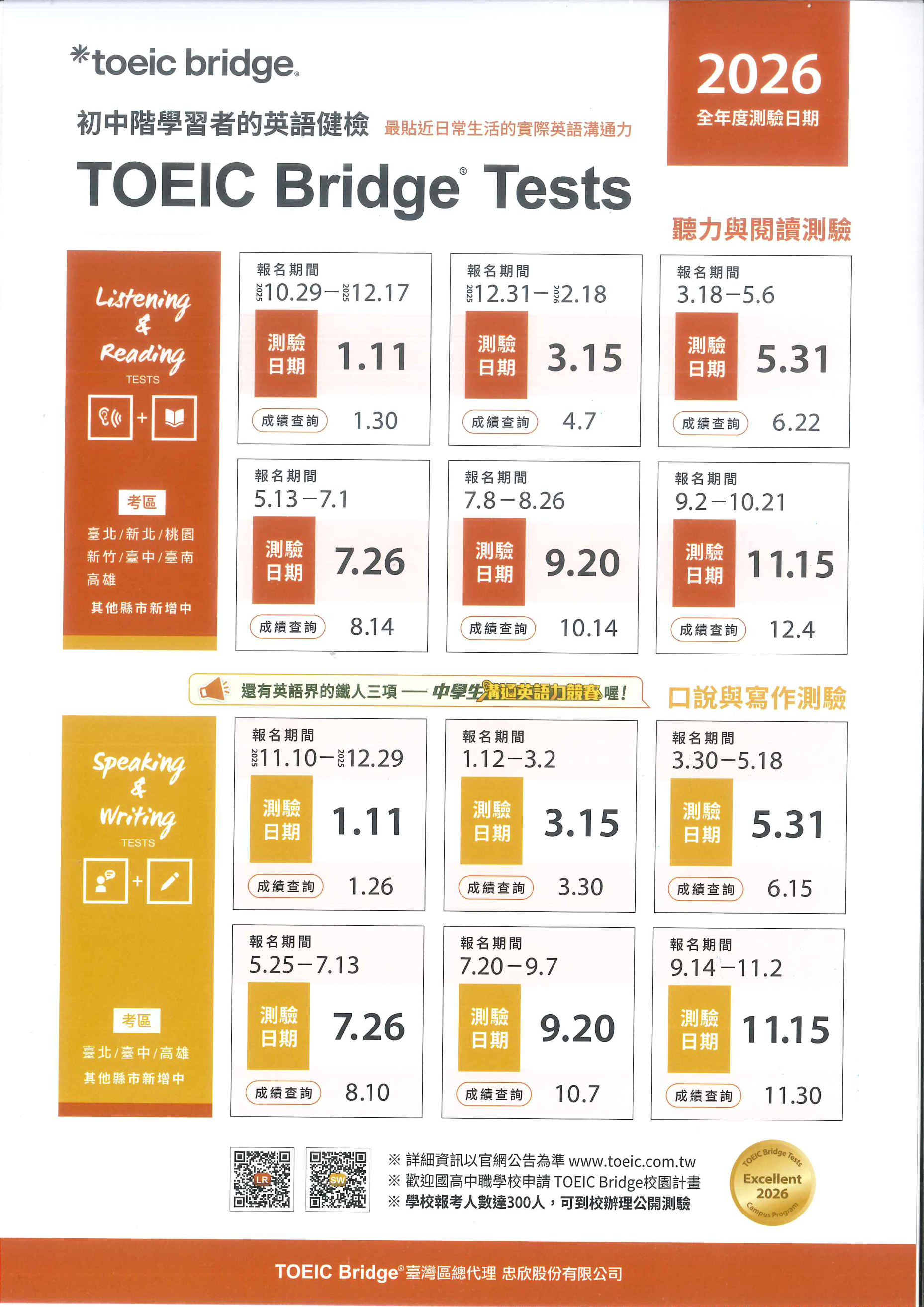 五、 隨函檢附TOEIC Bridge公開測驗考期海報,敬請 惠予公告轉知。