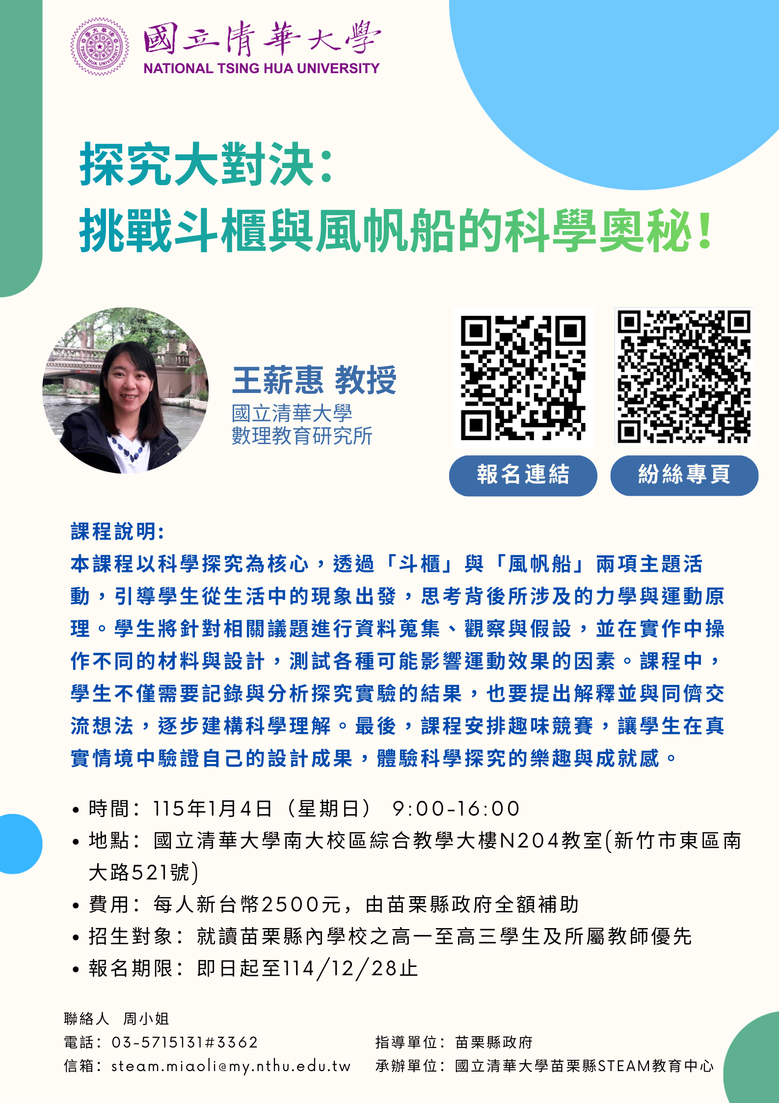 【轉知】清華大學「探究大對決:挑戰斗櫃與風帆船的科學奧秘!」主題課程