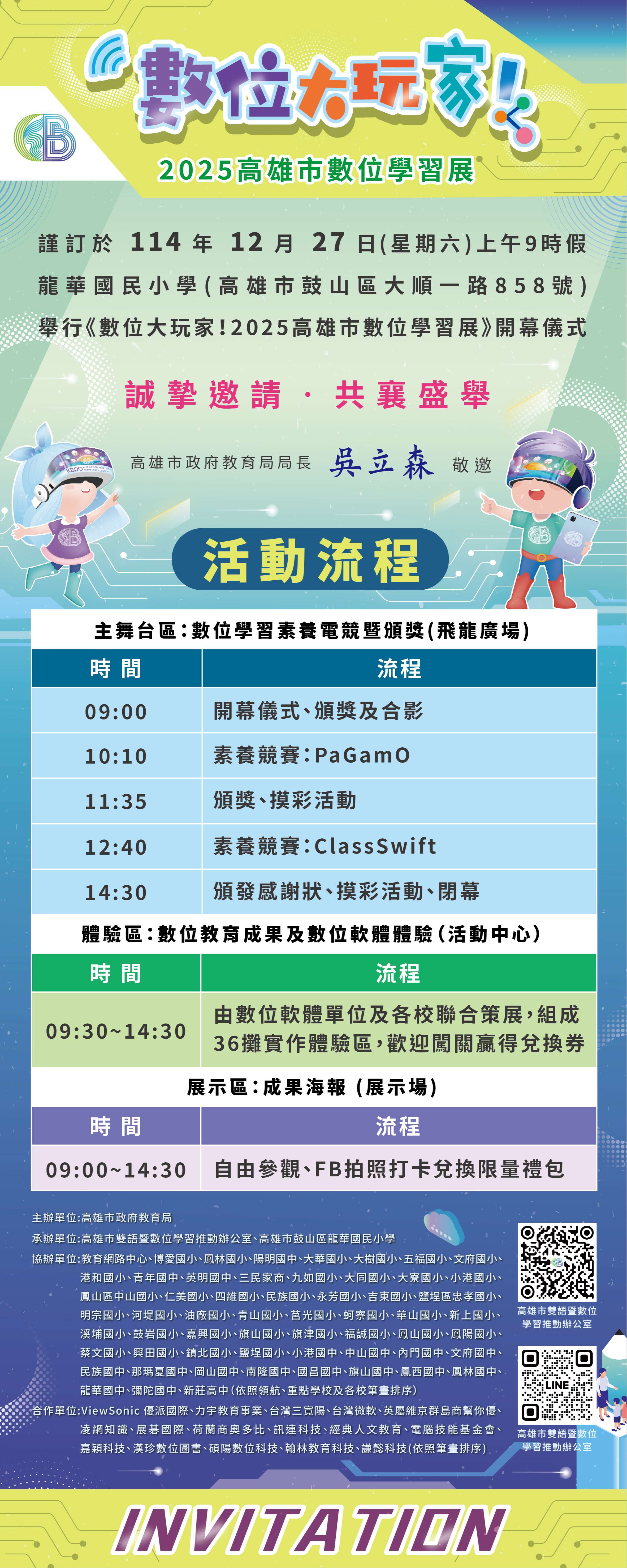 二、 為展現高雄市數位教育推動成果,並持續推動「推動中小學數位學習精進方案」,以建構智慧校園環境丶促進行政與教學數位轉型,體現智慧教育實踐成效,特辦理旨揭數位學習展。