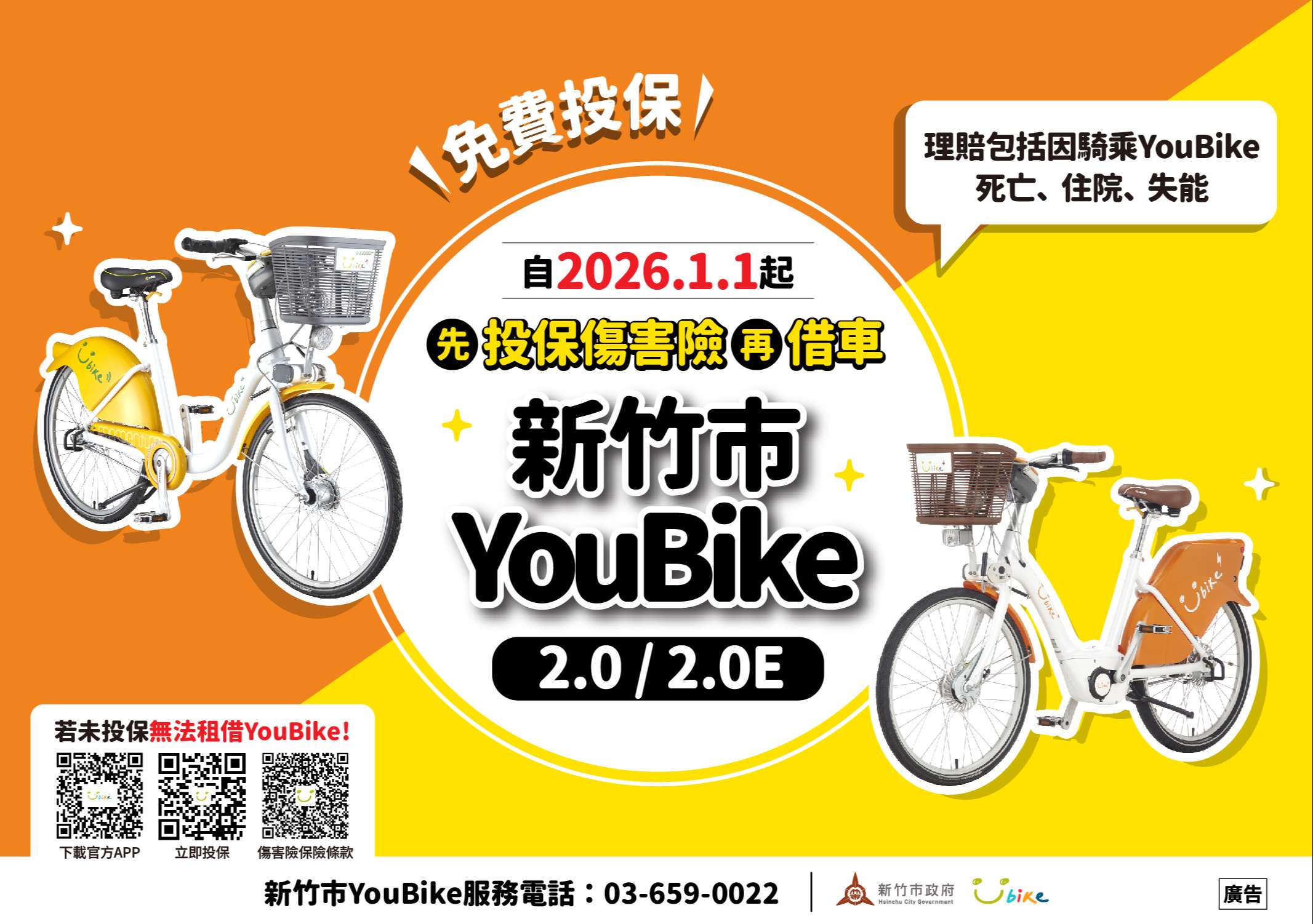 | 一、 | 考量民眾往來交通節點、學校、各級機關、觀光景點、旅遊中心及活動中心等場所頻繁、新竹科學園區、大專院校及各級學校,亦有學術商務交流,請各單位協助利用各式管道,宣導租借YouBike2.0全車種前需完成投保傷害險、投保免費及如何加保等資訊,自115年1月1日起,未投保傷害險無法借車。 |