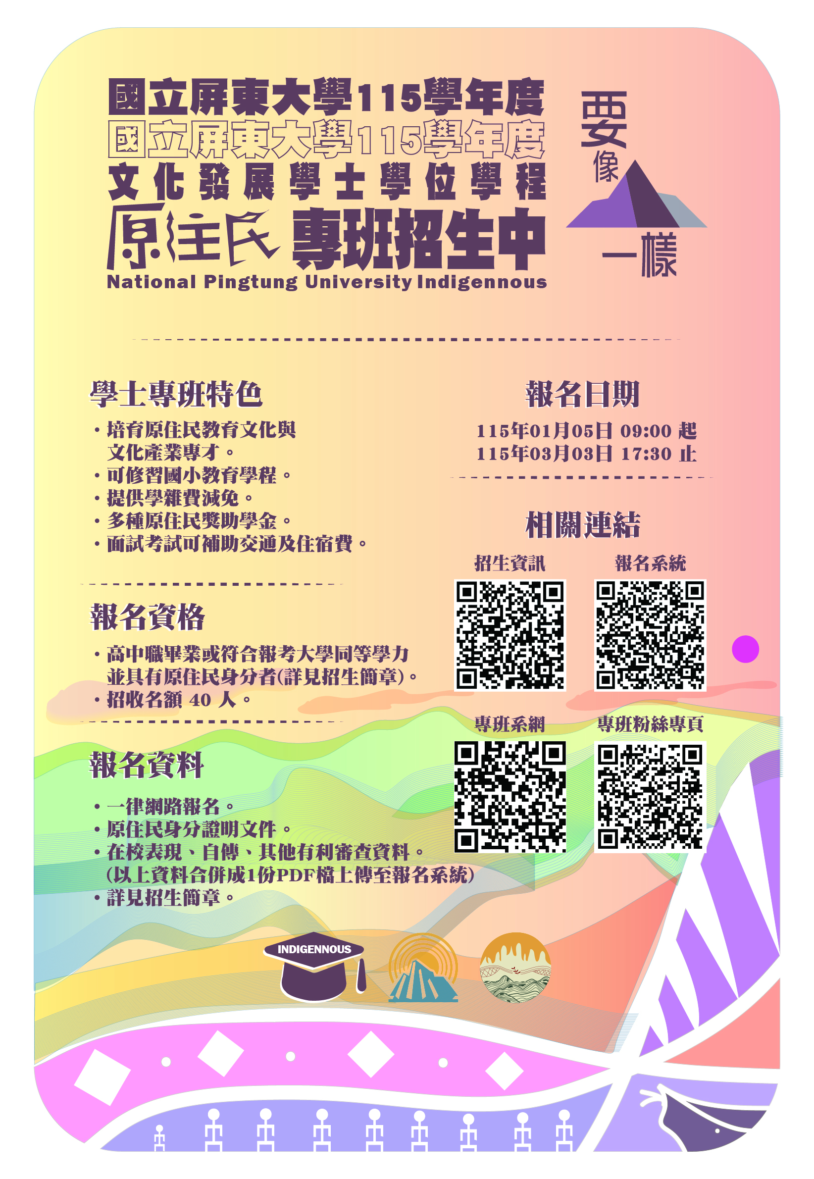 【轉知】屏東大學115學年度文化發展學士學位學程原住民專班入學招生