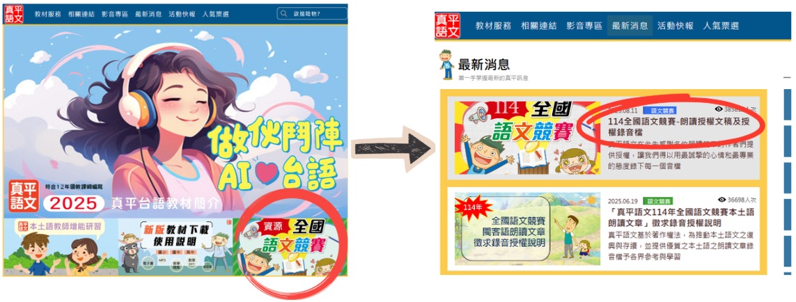 2.臺灣台語、臺灣客語朗讀音檔可至真平語文網下載,下載路徑如下圖。