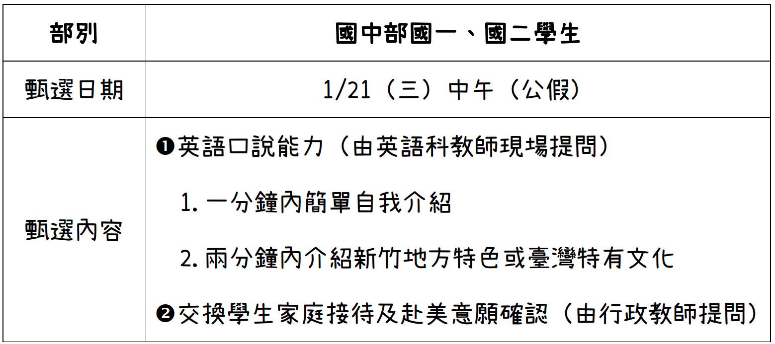※國二同學請留意,赴美時間將為國三時期,請審慎考慮升學課業及交換學生活動之衡量。