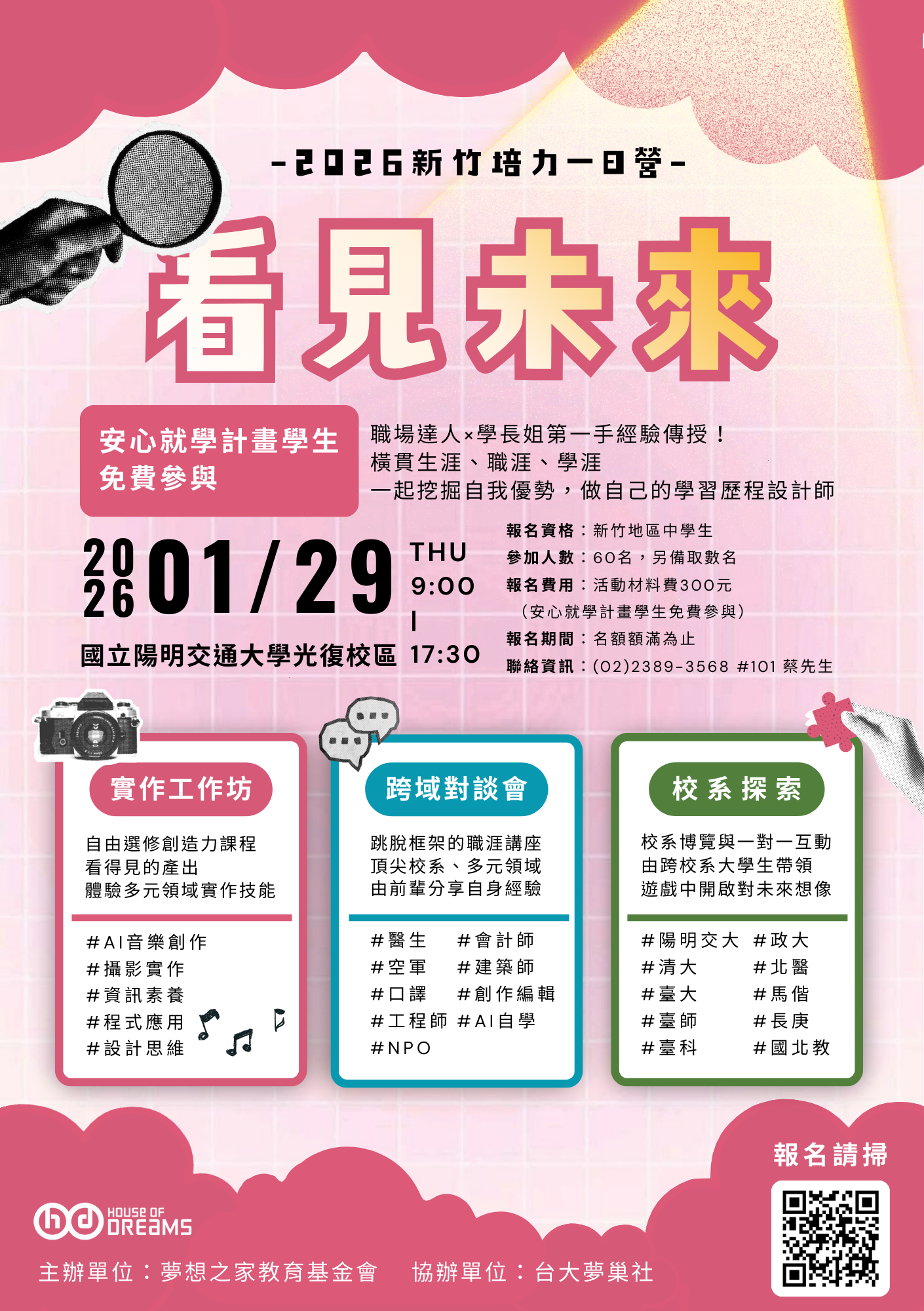 財團法人夢想之家教育基金會於 115 年度推動中學生職涯探索,推出『2026「看見未來」新竹培力一日營』 計畫,期望透過實作、對談與探索,帶領學生提前接觸科技應用、跨領域職場經 驗,協助其探索大學校系。