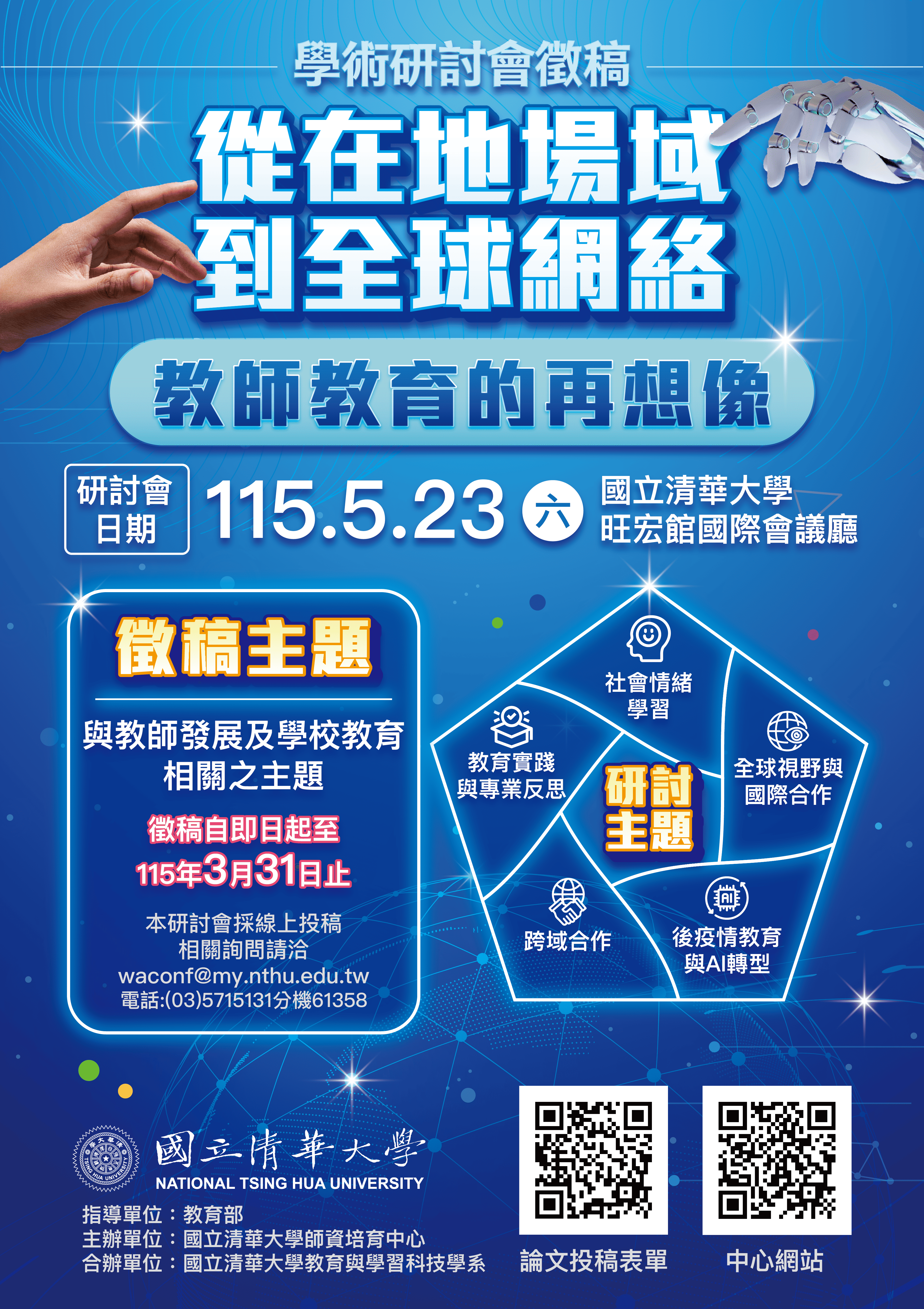 (三) 研討議題包含但不限於:教育實踐與教師專業反思、社會情緒學習(SEL)融入實踐、後疫情及人工智慧(AI)脈絡下的師資培育、跨域合作實踐,以及全球視野與國際合作等相關議題。