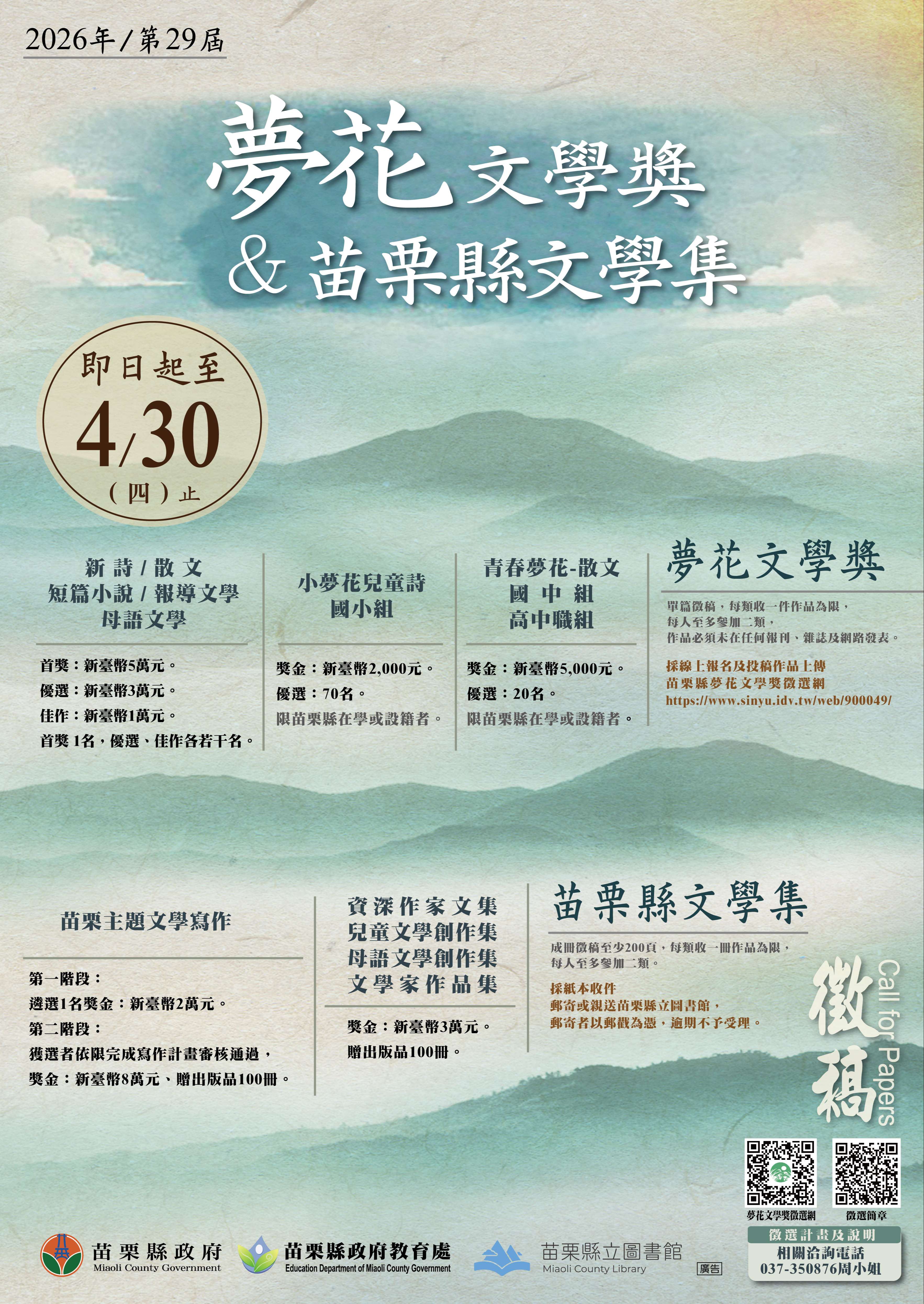 | 三、 | 第29屆夢花文學獎暨苗栗縣文學集徵選,收件時間自即日起至115年4月30日止。 |