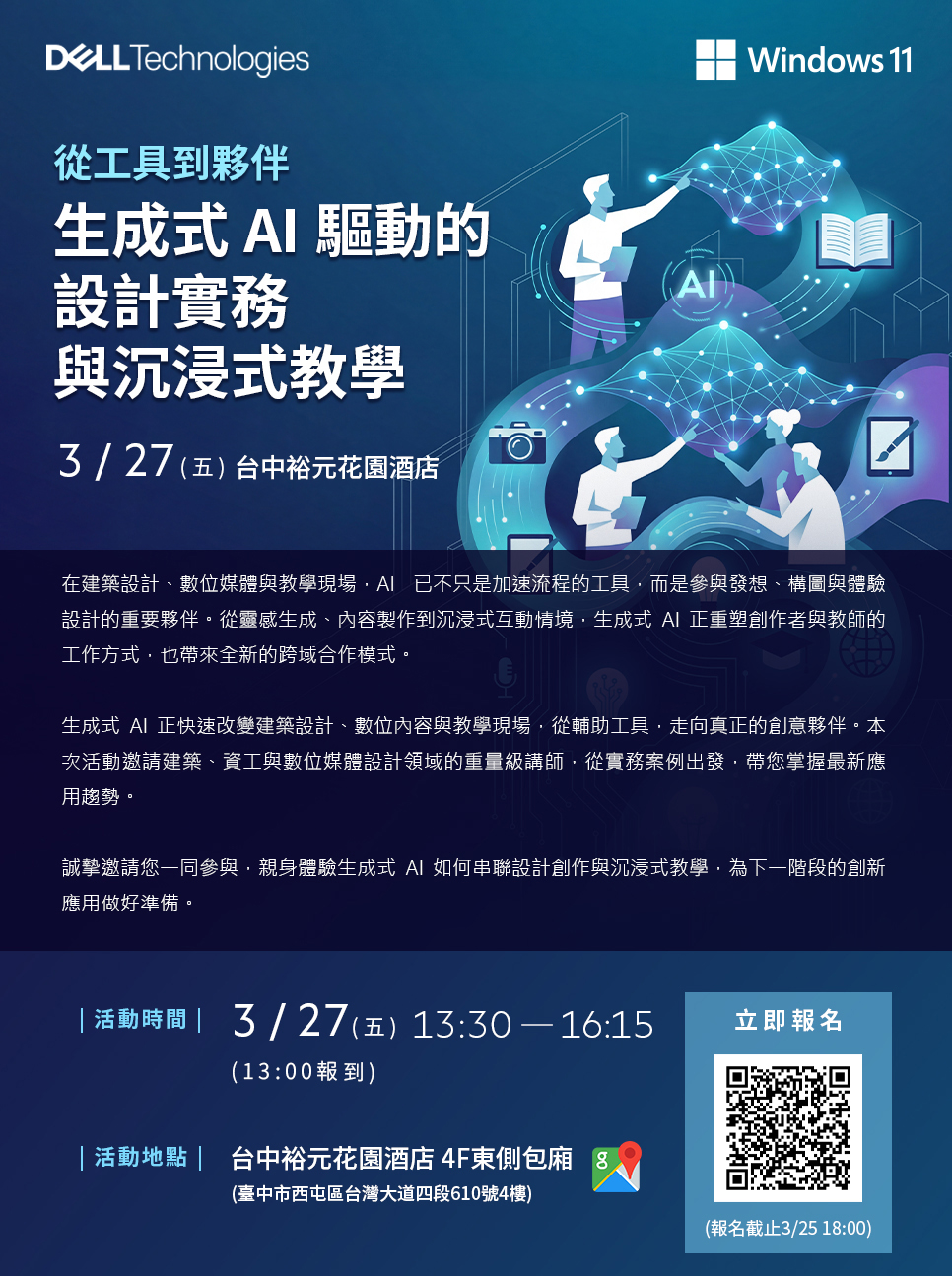 | 一、 | 旨案活動訂於本 (115)年3月27日( 星期五)下午1 時30分 , 假台中裕元花園酒店舉辦,針對建築、資工與數位媒體設計等專業領域,分享生成式AI應用趨勢與沈浸式教學經驗。 |