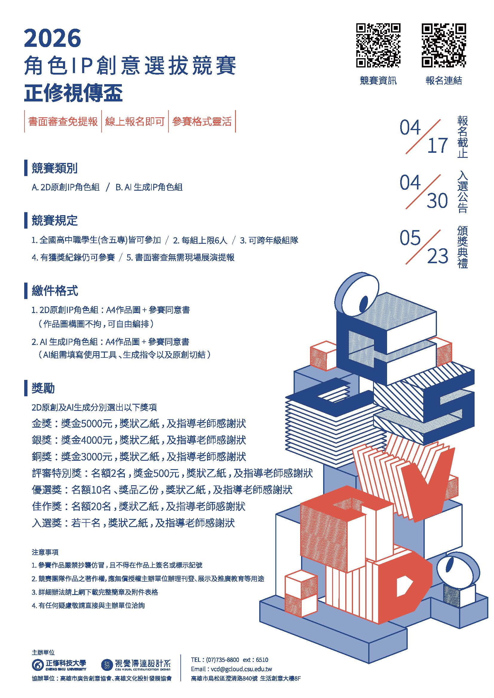| 主旨: | 本校視覺傳達設計系辦理「2026 正修視傳盃|角色 IP 創意選拔競賽」,邀請貴校學生報名參賽,請查照。 |