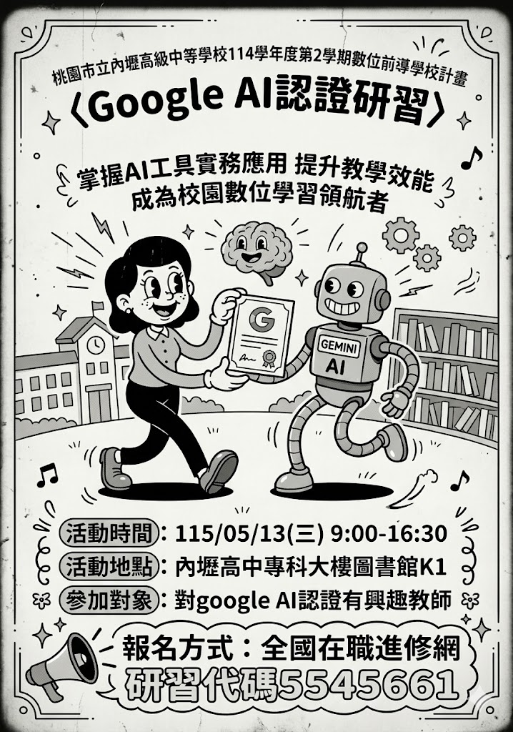 | 主旨: | 本校辦理114學年度第二學期教育部十二年國民教育課程綱要數位前導學校「Google AI認證研習」 敬請貴校教師參加,並惠予出席人員公(差)假,請查 照。 |
