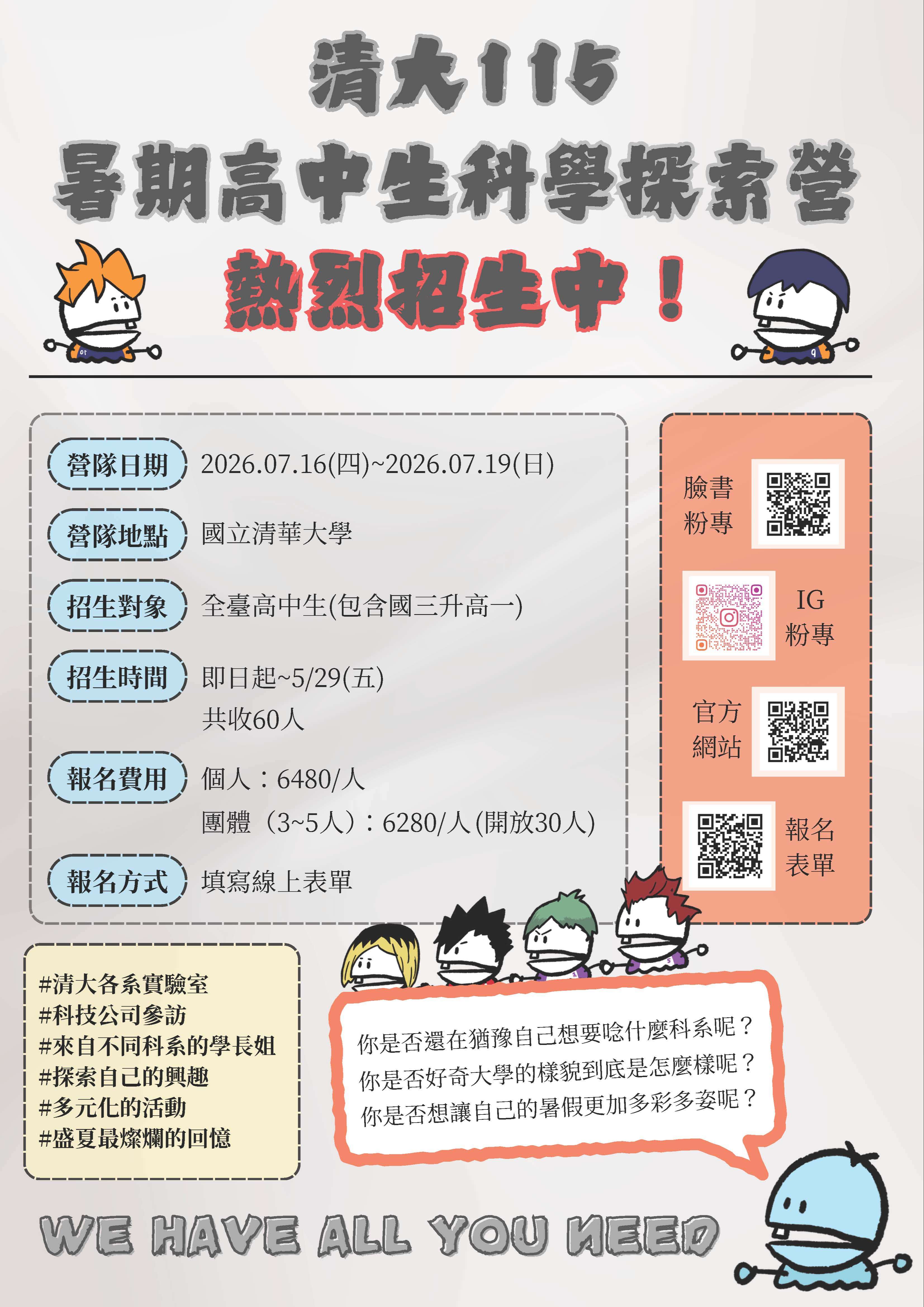一、 旨案活動資訊如下: (一) 時間:115年7月16日(星期四)至7月19日(星期日)。 (二) 地點:國立清華大學。 (三) 活動對象:全國高級中等學校學生。 (四) 費用:個人報名費用6,480元,團體報名3~5人每人6,280元。 二、 活動聯絡人:營長蕭雅之,手機:0978-838943,電子信箱:kitty20050806@gmail.com;企劃協調涂安忻,手機 :0978-602256,電子信箱:violet950301@gmail.com。 三、 報名表單:https://forms.gle/QnkLqSbTu5jspTLH7;營隊官網:https://nthussc.wixsite.com/home/news。 四、 檢附該營隊宣傳海報電子檔。