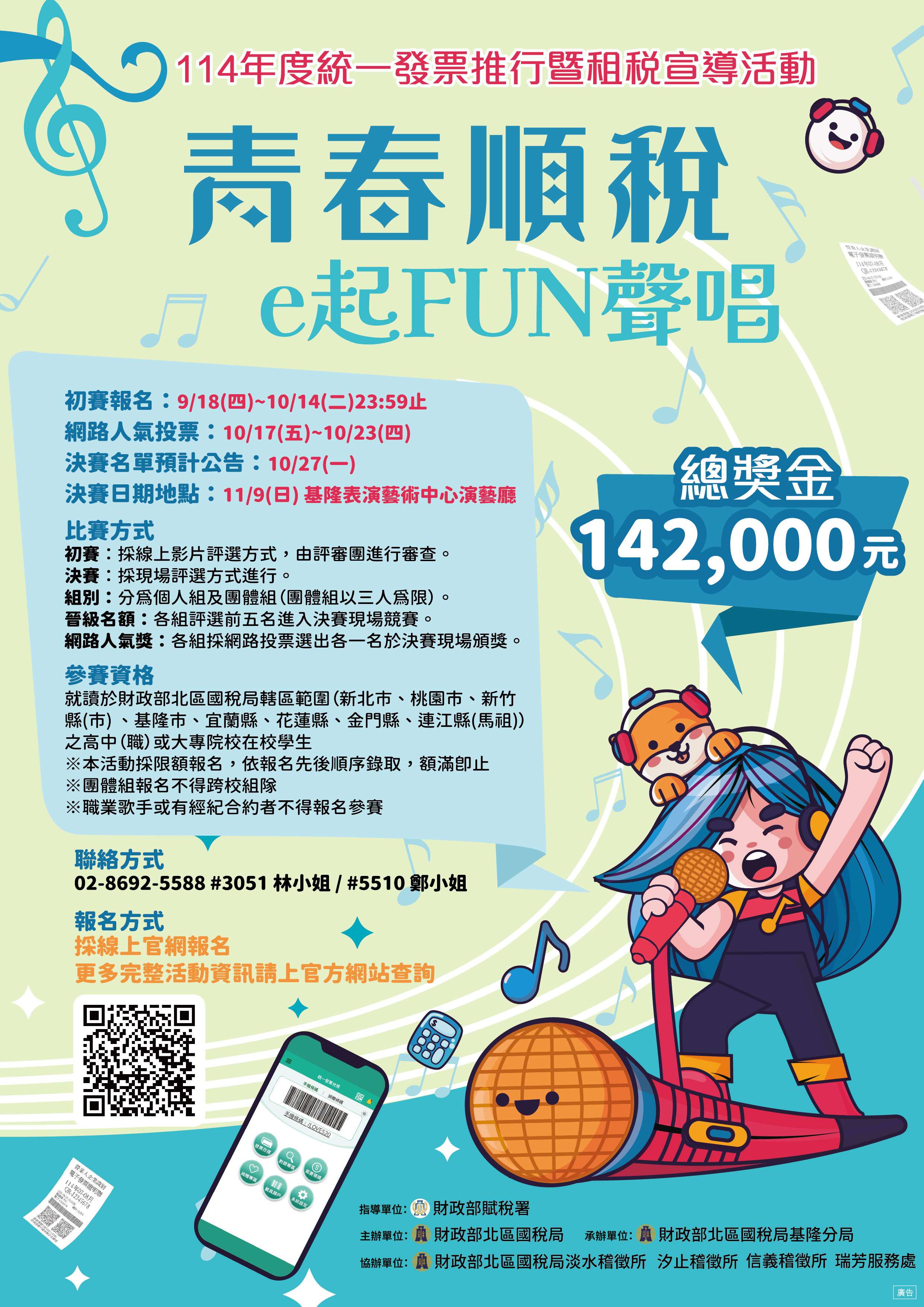 轉知財政部北區國稅局基隆分局舉辦「青春順稅 e起FUN聲唱」統一發票推行及租稅宣導活動歌唱比賽初賽,鼓勵參加。